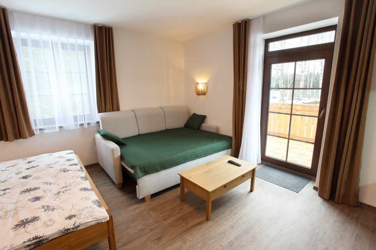Az apartman található, egy kis csendes faluban, közel a város Český Krumlov. Ez egy nagy szoba, ahol van egy nagy franciaágy, egy kiságy és 2 pótágy, egy fából készült asztal, egy sarokpad, egy fiókos szekrény, konyhasarok számos kényelmi (kis sütő indukciós - 2 főzőlap, hűtőszekrény, mikrohullámú sütő, gyorsforraló kanna), egy nagy fürdőszoba zuhanyzóval, külön bejárattal, folyosón. Az apartman nagy 55 m2. Mi található a hegyek lábánál Sumava, a lakás 500 m az erdő (Blanský les).