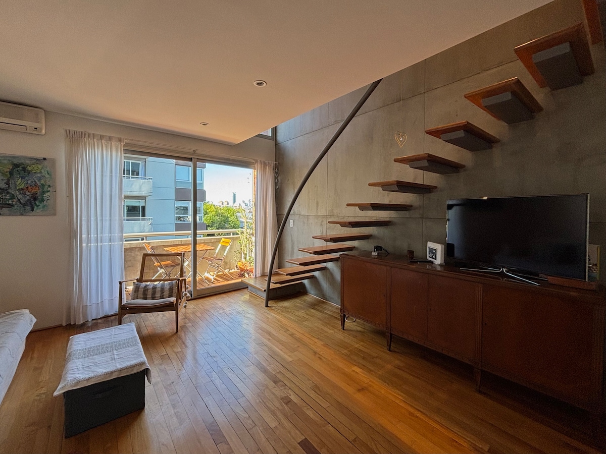 Cozy studio apartment in Palermo, with a private balcony, tree-lined view. Fully equipped with everything you need for a comfortable stay. It features a Queen-size bed, a fully stocked kitchen for two, TV with active streaming platforms, high-speed Wi-Fi, fresh linens and towels, and an in-unit washing machine. Located in one of the city's most convenient and sought-after areas, surrounded by a wide variety of restaurants, shops, the Movistar Arena, and excellent public transportation options.
