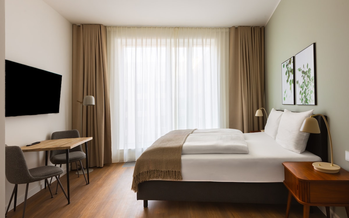 Élvezze a kényelem és a funkcionalitás tökéletes keverékét átgondoltan berendezett szobánkban, amely ideális rövid látogatásokhoz és hosszabb tartózkodásokhoz egyaránt. A 22–24 m²-es lakóterű szoba kombinált nappali, munkaterület és hálószoba, így különösen alkalmas bármilyen utazó számára. Aludj nyugodtan egy kényelmes kétszemélyes ágyban, és a dedikált munkaterület ideális környezetet biztosít a produktív napokhoz. A szobában egy kényelmes ülősarok is van egy karosszékkel