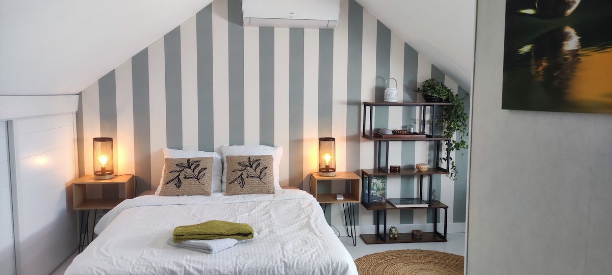 Bienvenue dans notre maison indépendante. Vous y trouverez: A l'étage climatisé: 2 chambres 1 lit de 2 personnes et 2 lits de 1 personne aménagées avec penderie et étagères et une sdb avec douche et WC. Au rez de chaussée: Une cuisine aménagée avec plaque induction, four électrique, lave linge, senseo, bouilloire, grille pain. Un salon avec un canapé convertible, TV, wifi et jeux de société. Accès vers l'extérieur sur une terrasse cosy toute équipée discrète. L'arrivée est autonome.