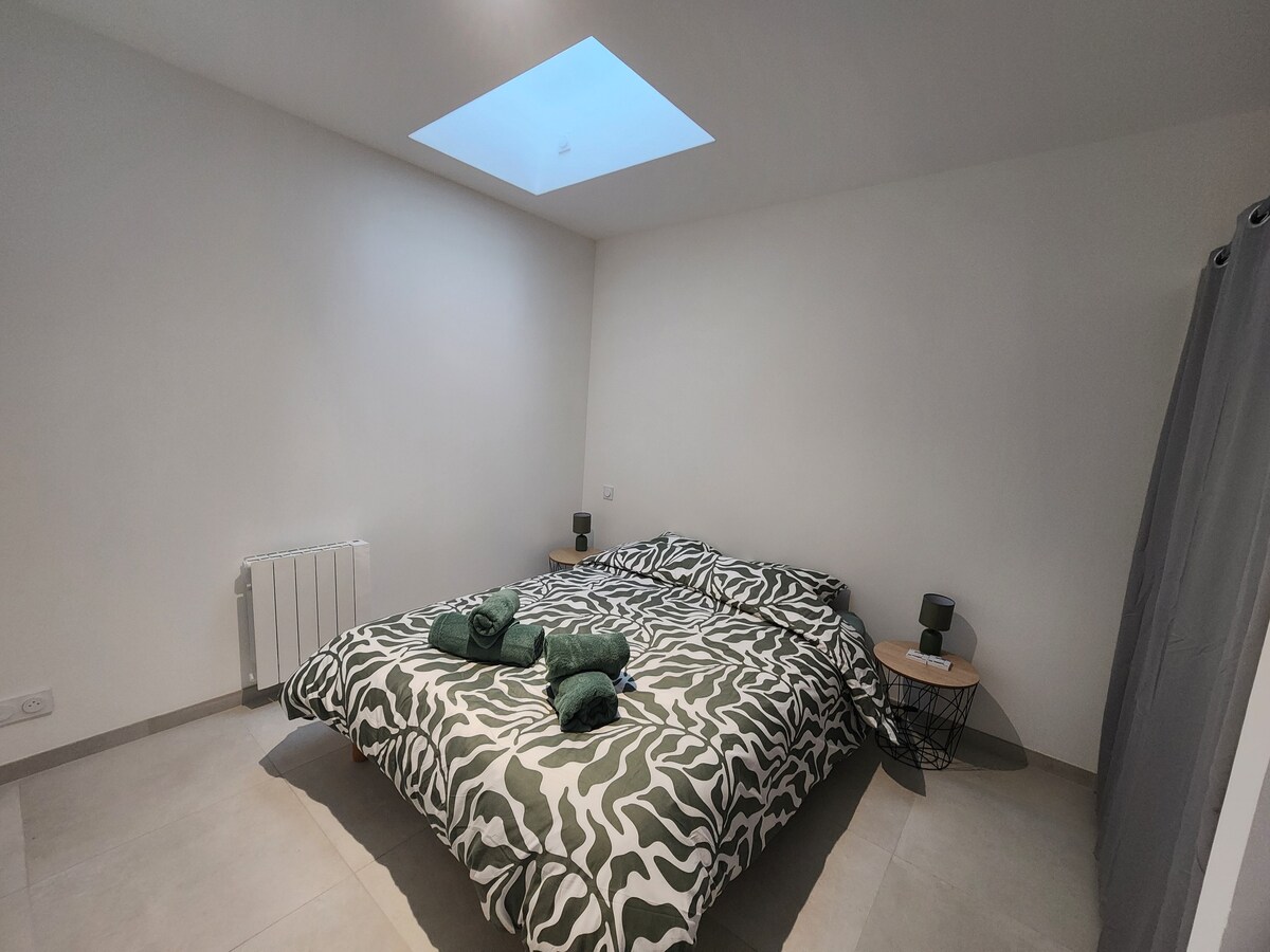 ⸻ Üdvözöllek Sam és Léa házában Chaumes-en-Retz-ben! Tarts egy kis szünetet, és lazíts egy zöld és békés környezetben, miközben a kényelmi szolgáltatások és a tenger közelében maradsz (7 km-re a legközelebbi strandtól, 10 percre Pornic-tól). Független, berendezett stúdiónk, amely fő lakásunk kertjében található, hangulatos, világos és funkcionális helyet kínál, ideális egy rövid, két fős utazáshoz. Teljesen felszerelt nappalival és egy szomszédos fürdőszobával rendelkezik, amelyben mosdókagyló, zuhanyzó és WC található.