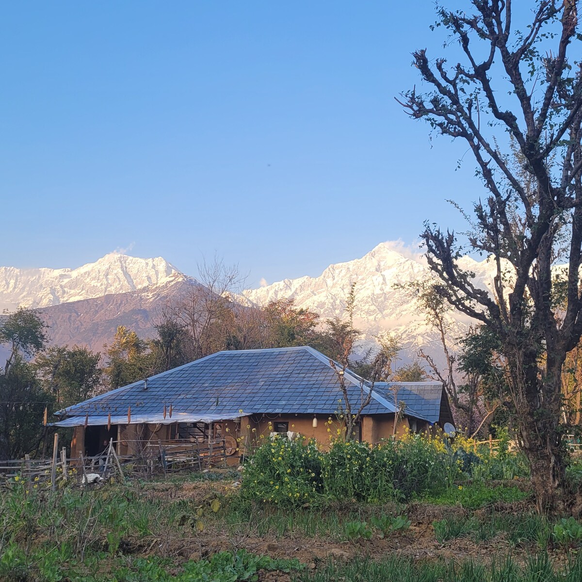 Mud and bamboo house awaits visitors in a beautiful setting at the foot of the mighty Dhauladhar mountains in the lush green Kangra Valley. This compact & cozy house made of local materials is in sync with nature and surroundings. Indoors include a kitchen and two rooms. There is ample common space to sit, work, meditate or relax with a book. This area is known for easy, picturesque walks among the hills, grasslands or farms. The tea town Palampur is just a 15 minutes drive away!