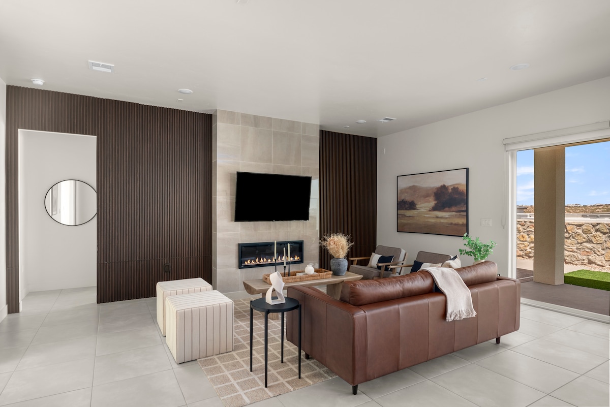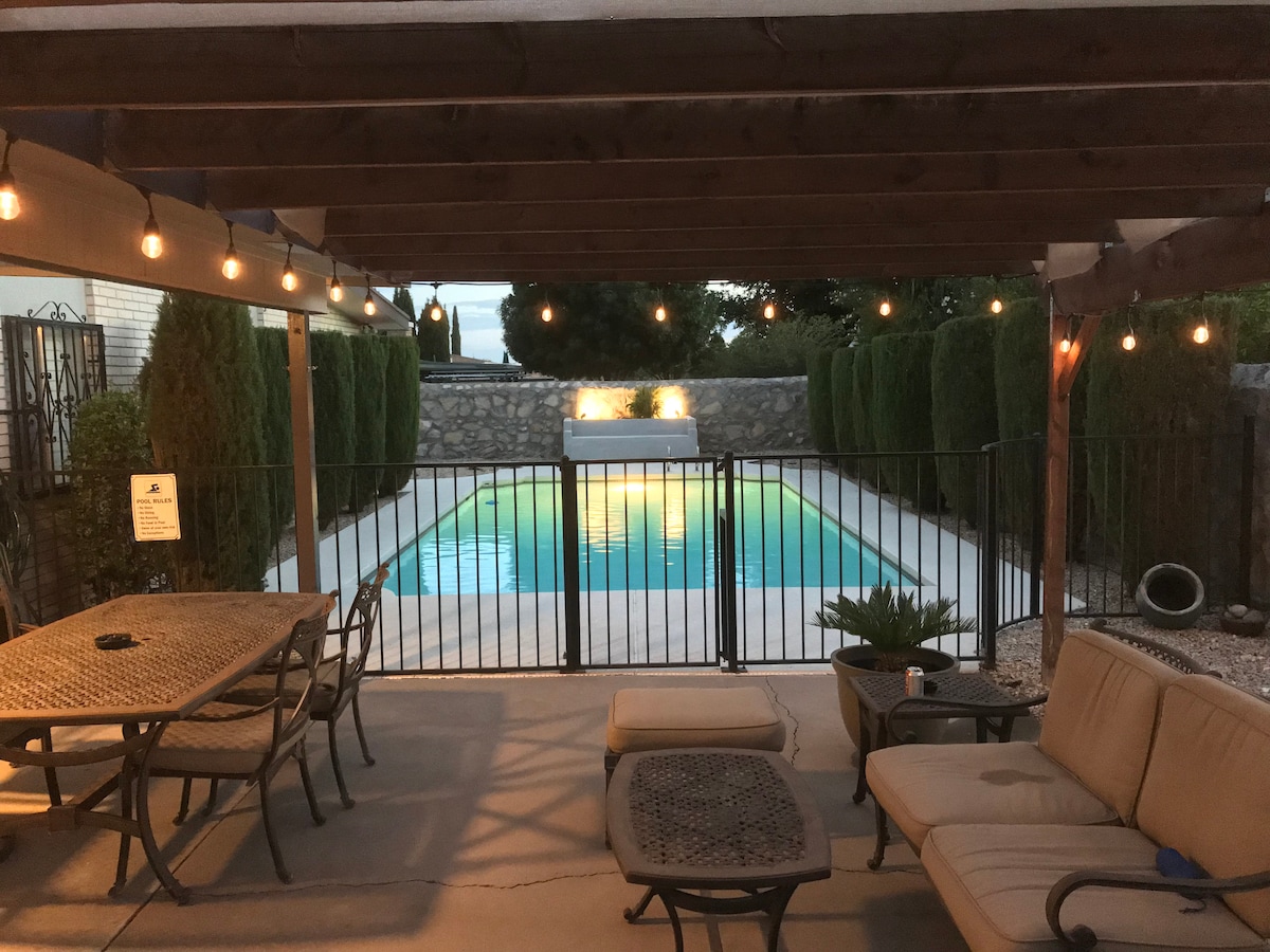 Beautiful brand new modern home. Sparkling heated saltwater pool & spa minutes away from dining & entertainment. Enjoy El Paso Sunshine in this Desert Oasis! House comfortably sleeps 6. Gorgeous fully equipped Chef's kitchen, beautiful Master Bedroom w/ huge walk in shower & jetted jacuzzi tub, 5 min away from I-10, 11 min from Cielo Vista/The Fountains, 18 min from Downtown, 10 min from Ft. Bliss. **please send us a message if you're having trouble booking**
