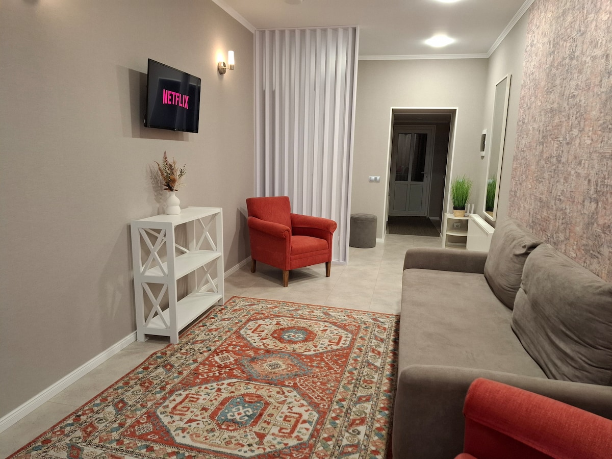 Elegáns szállás, neoklasszikus stílus, tágas, 98 m2-es, új tömb, csendes lakóövezet a park közelében (strand,sport és kikapcsolódás gyerekeknek és éretteknek). 5 perc sétára a bevásárlóközponttól ( bankok, piac, éttermek, McDonald's, kávézók, mozi, bowling) és 1,5 km-re a városközponttól. A tömegközlekedés könnyen elérhető. Teljesen felszerelt konyha, 2TVsmart, Netflix, Wi-Fi Számunkra az otthon tisztasága és az ügyfelek kényelme a legfontosabb