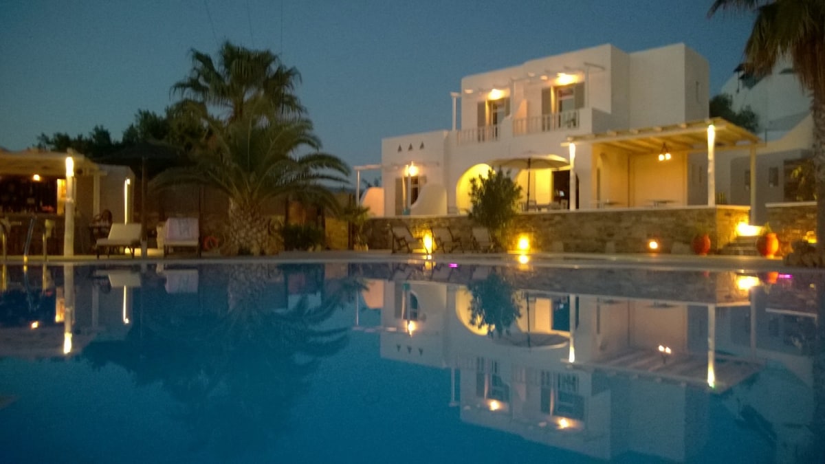 Olga's offers cycladic-style elegance, modern comfort (A/C, TV, WiFi) in a friendly relaxed setting: Beautiful pool & bar, all rooms with ensuite showers, private balconies with pool views, locally-sourced breakfast, excellent service, great location!