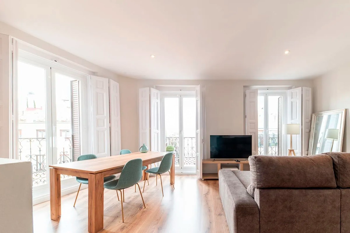Piso moderno y espacioso con balcón en el barrio popular de Chueca. A 2 minutos andando de la más famosa calle de Madrid "La Gran Vía", llena de tiendas, restaurantes y algunos de los edificios más emblemáticos de la capital. Disfrute alojarse en el centro de Madrid e ir andando a lugares emblemáticos como la Plaza de Sol, Cibeles, Puerta de Alcalá, el Museo del Prado, el Palacio Real y sus jardines, la catedral de Santa María la Real Almudena, el Teatro Real y la Plaza de Oriente.