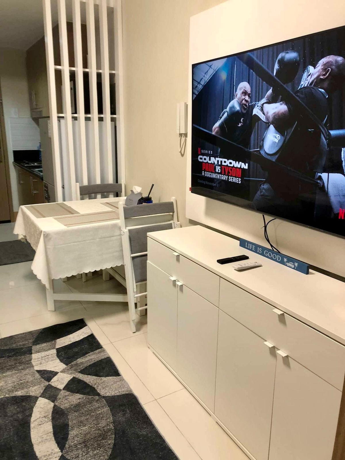 A Poblacion, a Makati étterem és a szórakoztató negyed szívében található egységünk egy 24 órás biztonsági szolgálattal rendelkező butikház 2. emeletén található. Az 1br modern indonéz, balinéz belsővel és olyan kényelmi szolgáltatásokkal büszkélkedhet, mint egy 55hüvelykes tévé, Netflx, 550 Mbps, teljes konyhával. Sétálj el a közeli bárokba, alkalmi éttermekbe és finom éttermekbe. Tapasztald meg a művészetet és a kultúrát Tökéletes úti cél pároknak, egyéni kalandozóknak, üzleti utazóknak, rövid utazásoknak és nyaralásoknak!