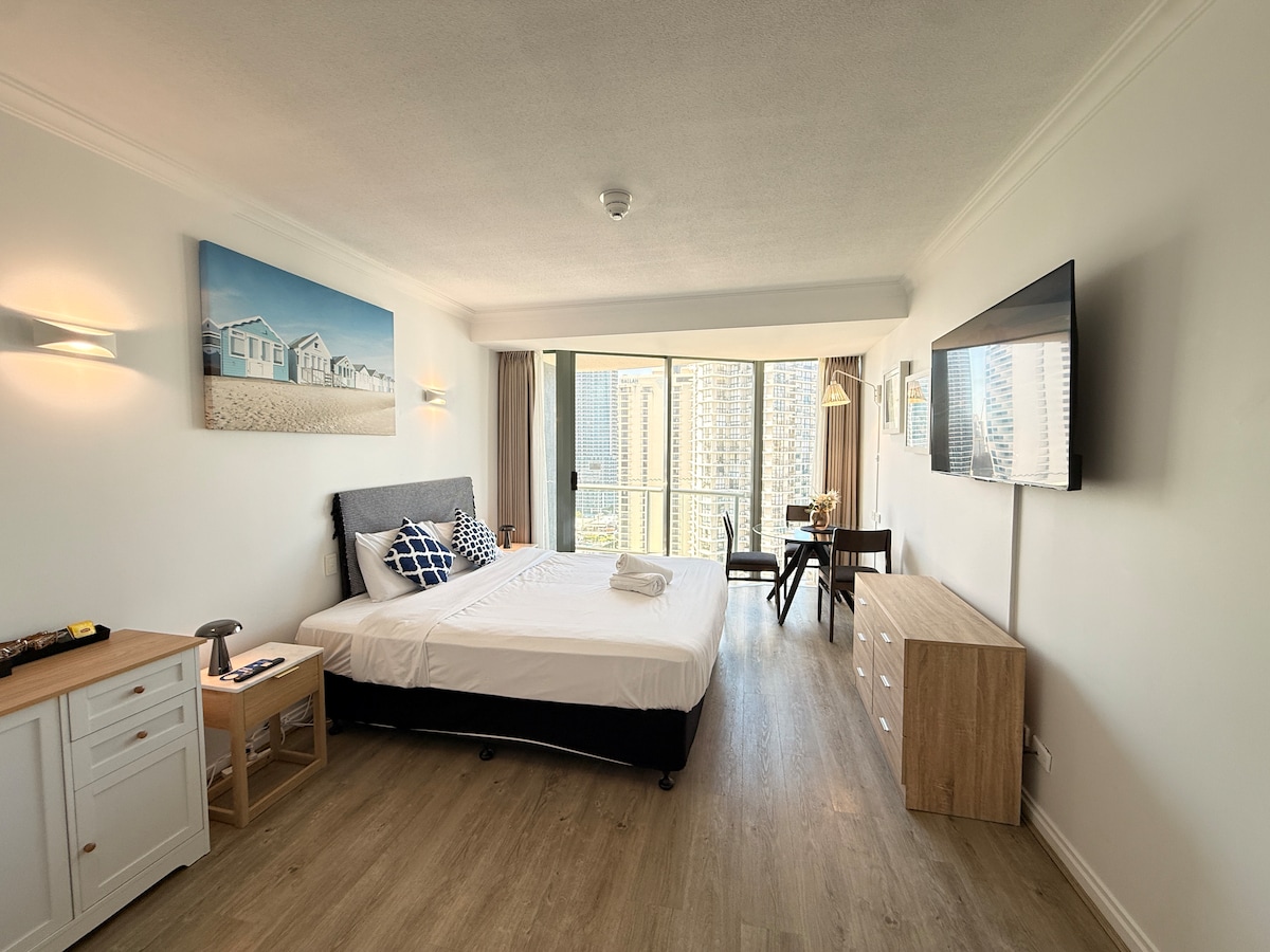 Ébredj lélegzetelállító kilátással az óceánra – privát stúdió a szörfösök paradicsomának szívében 17. szint! Pihenj a saját stúdiólakásodban, amely két hangulatos franciaággyal, saját fürdőszobával és lenyűgöző kilátással rendelkezik az óceánra. Csak 2 perc sétára a strandtól, kávézóktól és helyi éttermektől, kényelmes hozzáféréssel a tömegközlekedéshez a Gold Coast felfedezéséhez. lift és minden, amire szükséged van a kényelmes tartózkodáshoz. Nyilvános parkolási lehetőségek: Az út túloldalán: 10 dolláros nap A helyszínen: 30 dollár/nap
