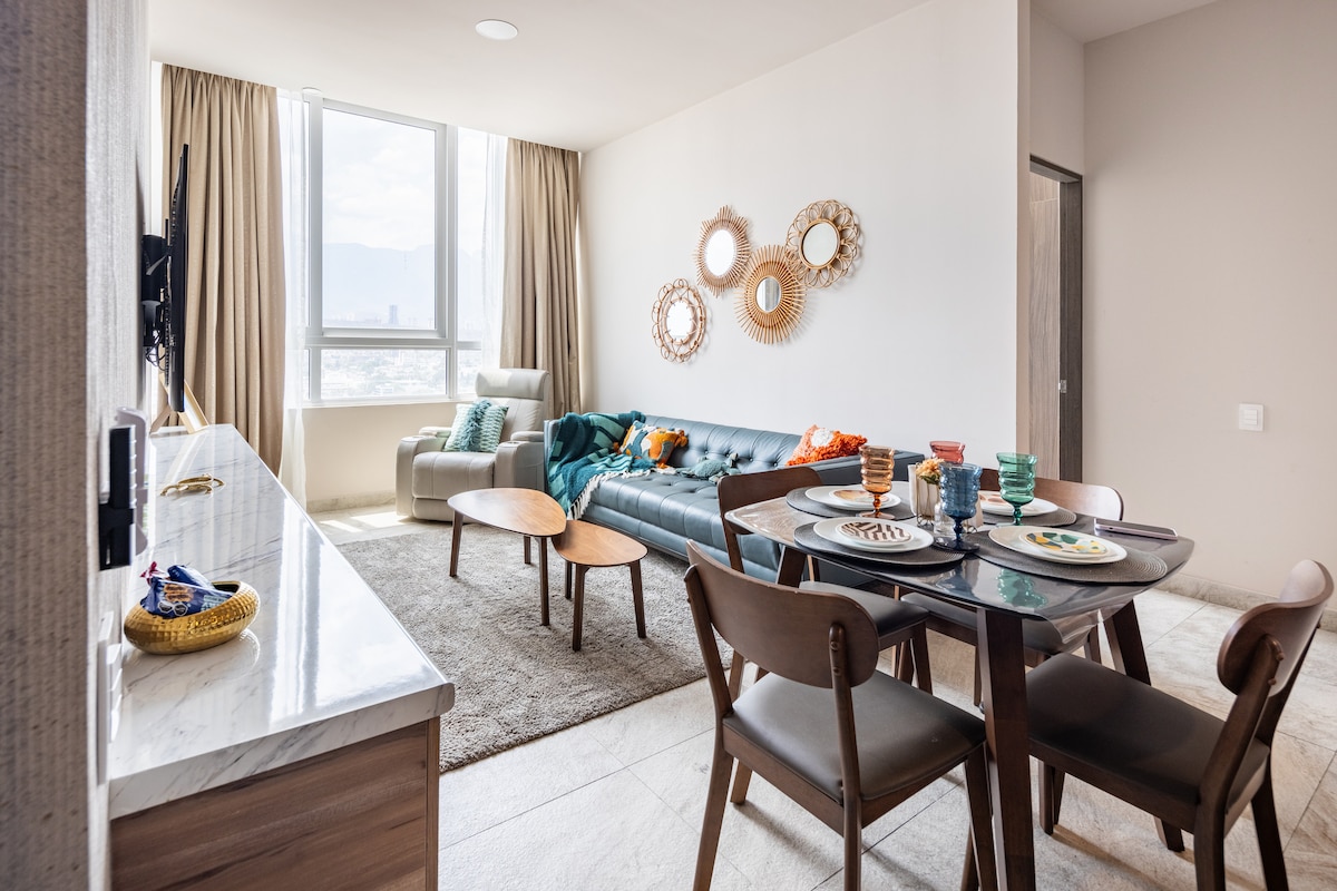 Comfort and location in the heart of Monterrey Start your day with delicious coffee and purified water—on the house! The apartment is on the 14th floor, with a balcony and beautiful west‑facing views. Includes underground parking for 1 car. You’ll be just minutes from CAS, Macroplaza, Barrio Antiguo, and Escenario GNP, surrounded by restaurants, convenience stores, and museums that will make your stay super comfortable. Perfect for remote work: fast internet, A/C, and a dedicated workspace