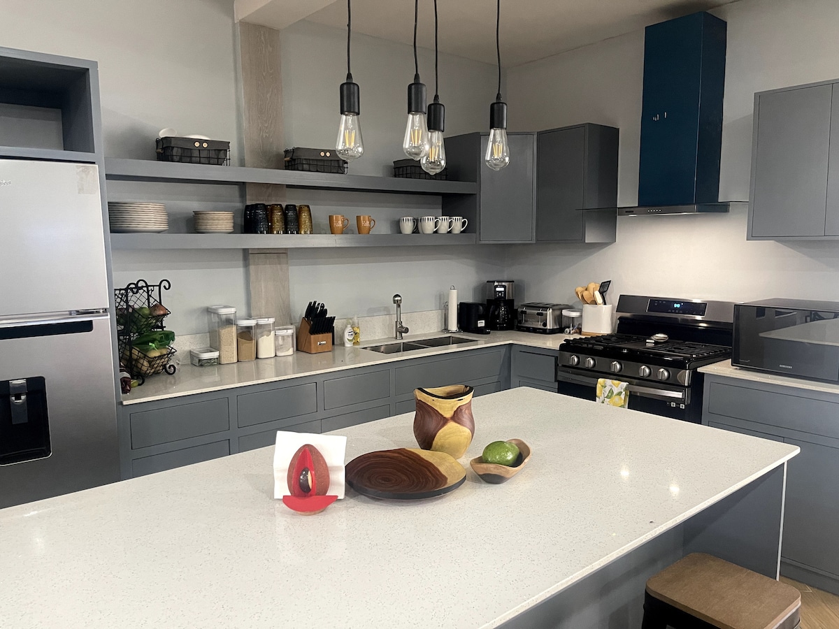 Enjoy a stylish experience at this centrally-located place! This recently renovated house is located in a safe gated residential area, it takes a seven minutes drive to get to Galerias Santo Domingo mall, restaurants, supermarkets, pharmacies and much more. It offers a private and quiet accommodation for vacationers and business travelers. The unit features a comfortable king sized bed, 1 queen and 1 full sized bed. TV and AC, hot water, washer and dryer, work space and a delightful kitchen.