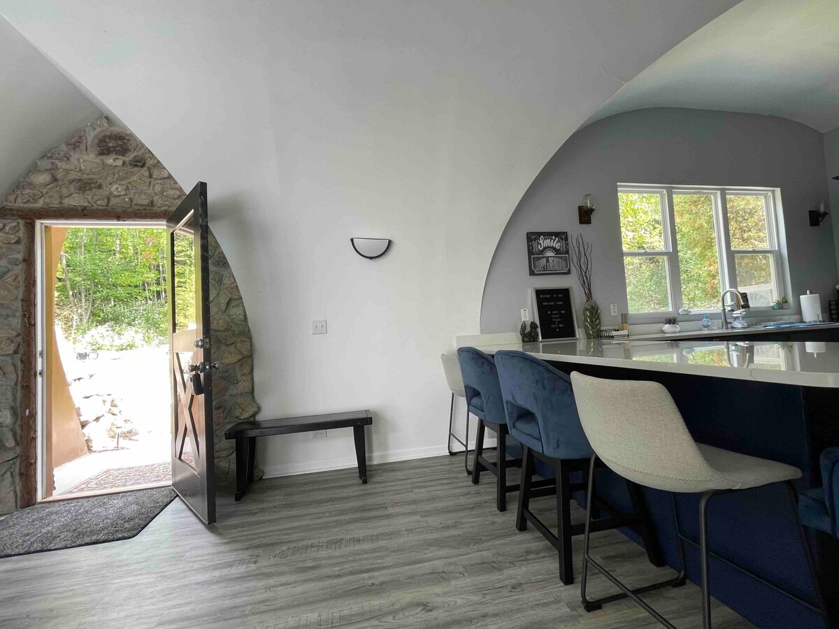 A Crystal Mountain közelében, a Betsie folyónál található romantikus, A-alakú ház saját pezsgőfürdőt kínál a csillagos ég alatt, valamint fényes beltéri kandallót és a folyóra néző tetőtéri hálószobát. Kortyolj helyi kávét az eszpresszó bárban, horgássz a folyóparton, vagy lazíts a tűzrakóhely mellett. Pároknak tervezték, de kényelmes a kis családok számára is, akik békés kikapcsolódásra vágynak a folyóparton. A hétvégi dátumok gyorsan lefoglalódnak – foglalj korán, hogy biztosan szállhass meg.