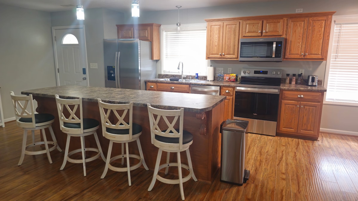 * HÁZIÁLLAT NEM MEGENGEDETT, KIVÉTEL NÉLKÜL * *NE MOZGASD A BÚTOROKAT, beleértve az ágyakat is!* Az 1. emelet tágas, TV-vel a nappaliban, és bőséges ülőhellyel a nyitott nappaliban. A konyhában minden megtalálható, ami a főzéshez és a hátsó grillezéshez szükséges! Az emeleten egy szórakoztató loftlakás, 7 ágy és egy nagy zuhanyzós fürdőszoba is található. A ház az erdőben található, beépített padokkal ellátott tűzrakóhellyel, egy nagy elülső verandával, hogy élvezhesd az időjárást!