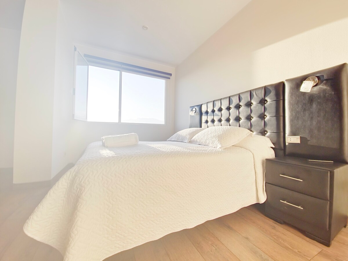 New and Modern Apartment on the Main Avenue of the Best Area in Cochabamba. ✨ Cochabamba legjobb bevásárlóközpontja előtt, éttermekkel, üzletekkel, szupermarketekkel és parkokkal körülvéve. ✨ Két hálószobája van Queen méretű ágyakkal és egy kétszemélyes kanapéággyal. ✨ Felszerelt konyha hűtőszekrénnyel, mikrohullámú sütővel és sütővel. ✨ Száloptikás Wi-Fi, Smart TV, Alexa. ✨ Közös terek (előzetes egyeztetés alapján): Terasz medencével és a legjobb panorámával, Edzőterem, Grill.