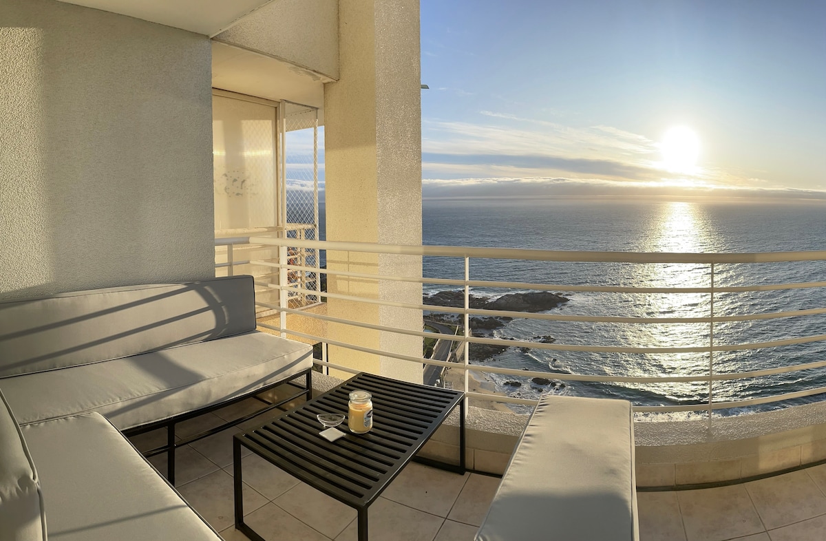 Aranyos stúdióapartman, széles és látványos kilátással a tengerre 180° -ban Valparaíso-tól Concónig, a 22. emeleten, digitális zár kulccsal, zárt terasz összecsukható üvegfüggönyökkel, privát parkoló elektromos kapuval (távirányító), Wi-Fi, TV-kábel, beltéri és kültéri medence, 24 órás portaszolgálat. Reñaca és Concón között található, szupermarketek, gyógyszertárak és pékségek előtt.