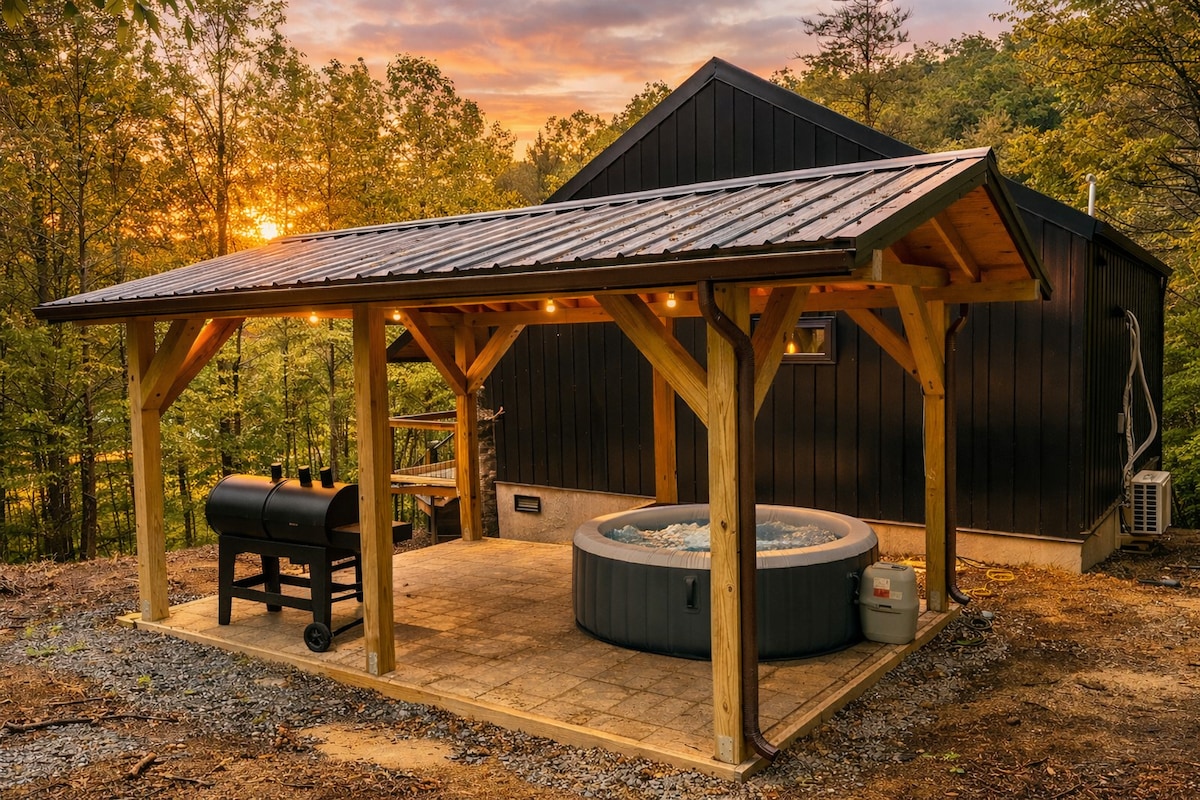 Elszigetelt Smoky Mtn kiruccanás: pavilon, pezsgőfürdő, king méretű ágy