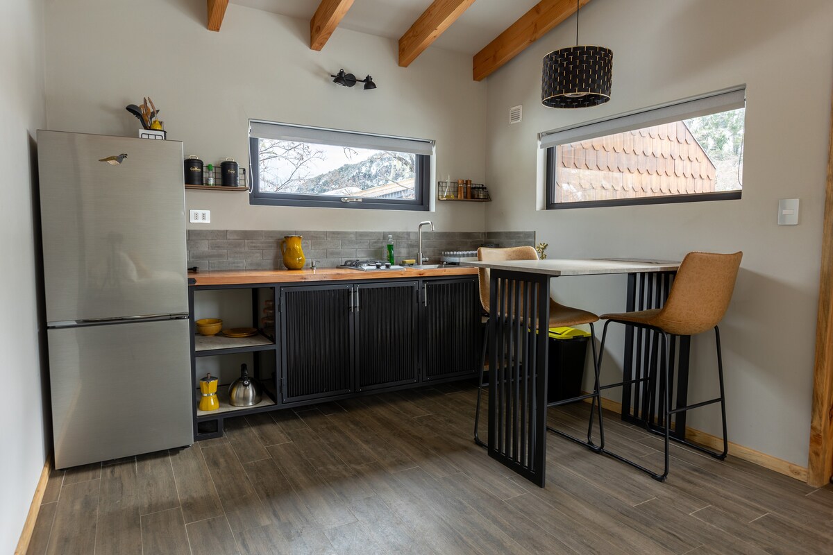Estamos ubicados después del retén de carabineros, si , te ahorrarás el famoso taco que se forma en invierno. Ven y descansa en medio del bosque nativo con acceso directo a circuitos de treking, cascadas, flora y fauna. El departamento tiene 40 metros cuadrados más terraza. Este cuentan con una cama King (180x200), baño, chiflonera o acceso ( donde dejar todo tu equipo de ski ), cocina más una mesa comedor y un espacio con dos poltronas frente a un gran ventanal para disfrutar de las vistas.