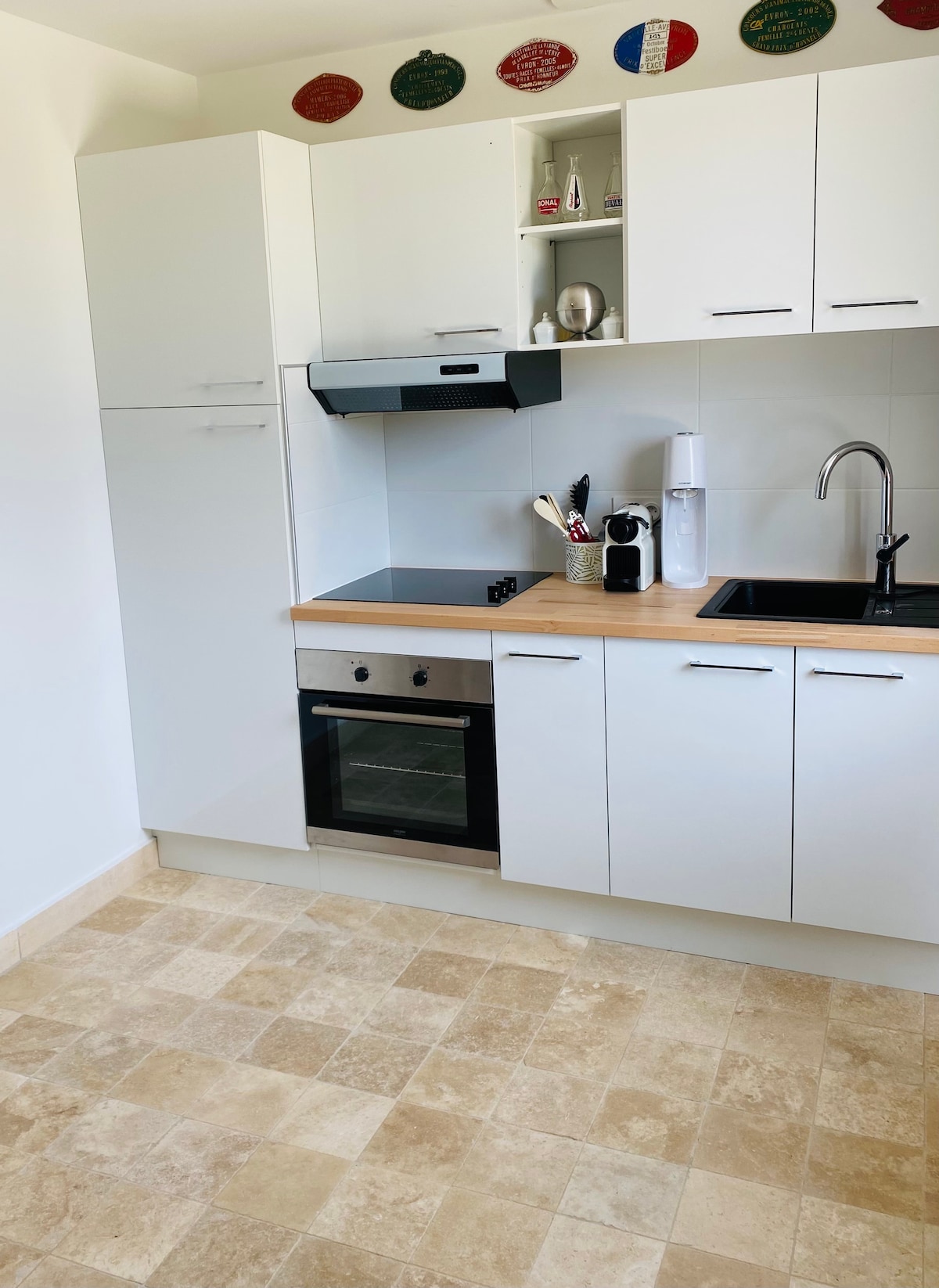 20 percre Lyontól, Beaujolais kapuinál, teljes nyugalomban. Az eredetileg a kastélyban található bemutatóteremben található otthont teljesen felújították, báját és történelmét modern és funkcionális felújítással ötvözve. Vidéki nappali, modern és tökéletesen felszerelt konyha, modern fürdőszoba, nagy zuhanyzó és japán vécé. Hálószoba , queen méretű ágynemű, közvetlen hozzáférés a teraszhoz. Bukolikus külső, dupla expozíciós terasz. Teljesen úszómedence.