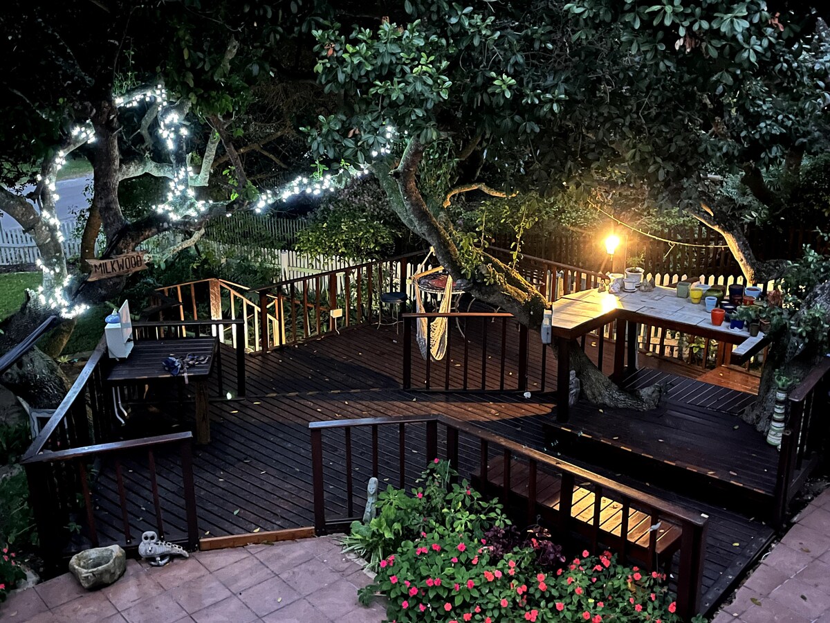 Kényelmes, tágas, 1 hálószobás, önellátó lakás mókás dekorációval az otthonunk felett. Ideális kiruccanás egy párnak a Garden útvonal felfedezéséhez. Extra hosszú dáma méretű ágy. Fürdőszoba zuhanyzóval és kiegészítő piperecikkekkel. Teljes konyha, étkező és társalgó kanapéval, TV-vel (Netflix) és ingyenes nagysebességű Wi-Fi-vel. Biztonságos utcai parkolás. Saját bejárat egy fából készült lépcsőn keresztül egy teraszra, ahonnan kilátás nyílik az erdőre. Sétatávolság az üzletektől. A lakásban nincs mosási lehetőség.