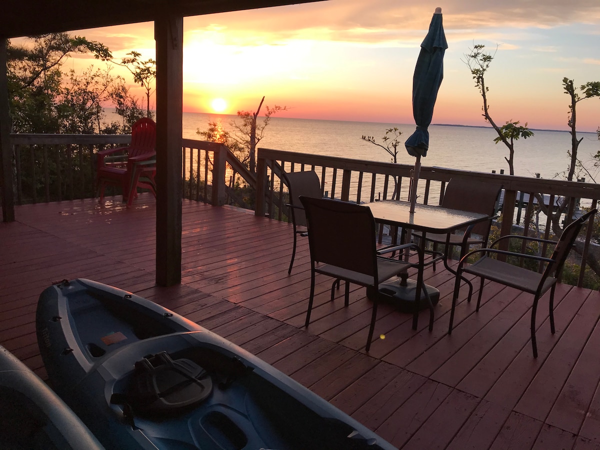 Ebben az egyedi és nyugodt kiruccanásban található, a Kitty Hawk-öbölre néző kilátással, ébredj fel a napfelkeltére a fedélzet felett, amely Colington Harbour egyik legmagasabb helyszíne. Nézd meg a naplementét az Albemarle Sound közepén, miközben 180 fokos kilátásban gyönyörködsz a teraszról. Élvezd a klubmedencét, a teniszpályákat, a kikötői játszóteret és a vízparti hangparkot. Ez a 2br 2ba újonnan lett frissítve az otthon minden kényelmével.