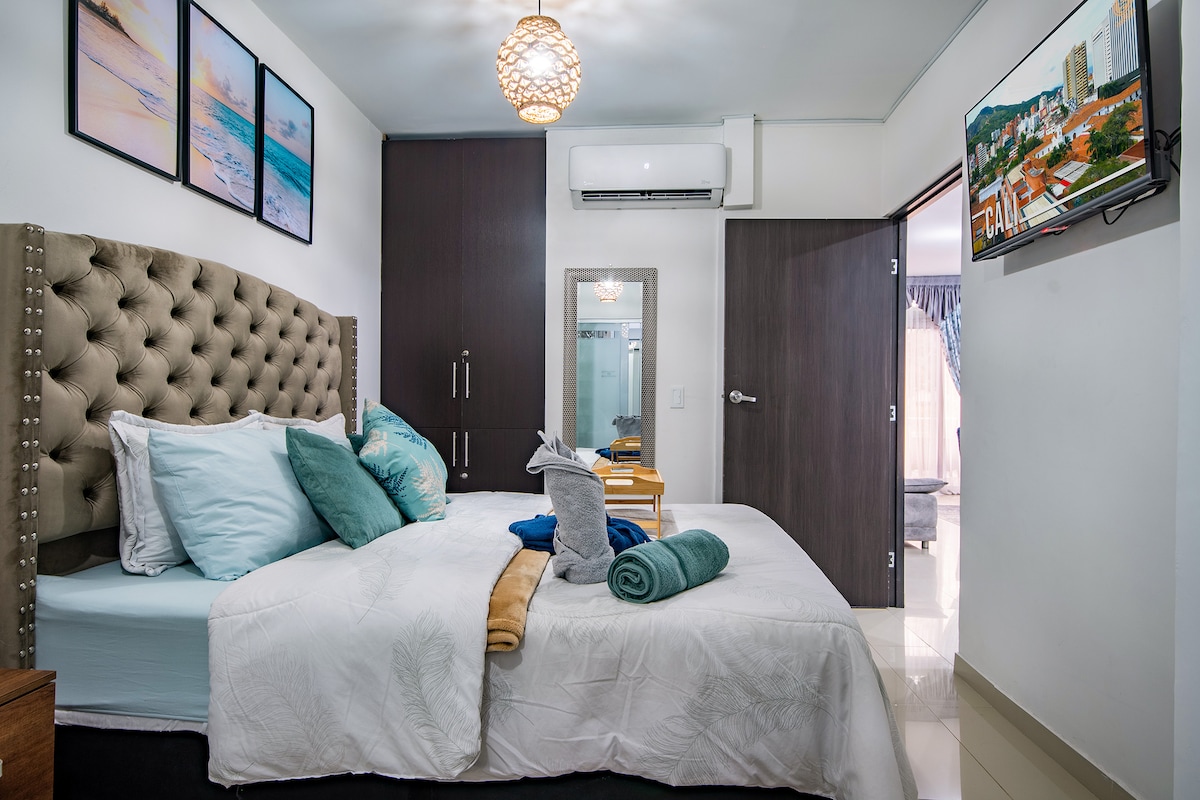 Élvezd Kaliforniát ebből az új, 15. emeleti, privát, sarokra néző penthouse lakásból, 180°-os kilátással és hihetetlen szellővel. Deluxe dizájn, hangulatvilágítás, légkondicionált szobák, felszerelt konyha, modern fürdőszoba és nappali/étkező természetes fénnyel. Ultragyors internet, TV prémium platformokkal és stratégiai elhelyezkedés Cuarto de Leguában, egy biztonságos park előtt. Tökéletes pihenéshez, munkához vagy hosszú távú foglalásokhoz. Kérdezz rá, hogy a szálláshelyet inkább párok vagy egyedülállók foglalják-e.