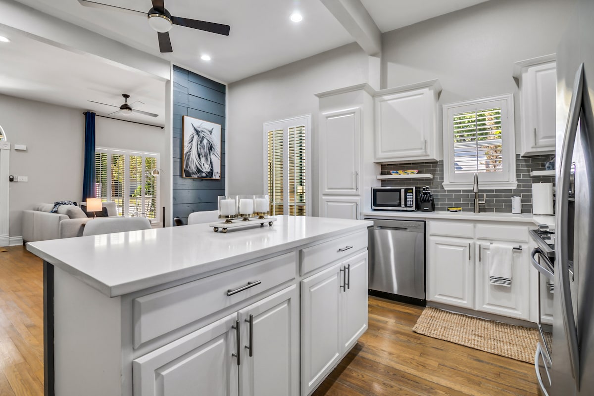Tapasztald meg McKinney történelmi belvárosát ebben a 3 BR bungalóban, amely ötvözi a vintage bájt a kortárs élettel, amely ideális párok vagy családok számára. A főtértől mindössze egy háztömbnyire található egy tágas nappali, teljesen felszerelt konyhával és természetes fénnyel teli étkezőasztallal. A tágas ablakok egy hangulatos, privát hátsó udvarra és teraszra néznek, ahol ülő- és gázgrill található. A szolgáltatások közé tartozik a nagy sebességű Wi-Fi, a plüss ágynemű, a légkondicionáló, a kavicsos jégkészítő, valamint a mosógép és szárítógép. Foglalja le szállását most!