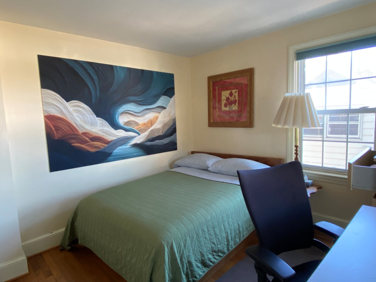 Ez a szoba a legalkalmasabb egy csendes, egyedül utazó számára. A második vendégnek éjszakánként 30 dollárt kell fizetnie. Saját hálószobád van franciaággyal, de a fürdőszobán osztozhatsz a többi vendéggel. Nagy sebességű Wi-Fi, over-the-air HDTV, ingyenes mosás. A szoba NEM rendelkezik utcai parkolóval. Ingyenes parkolás az utca mentén, buszmegálló a sarkon, metróállomás 15 perc buszútra. A konyha/étkező/nappali közös a ház többi tagjával.