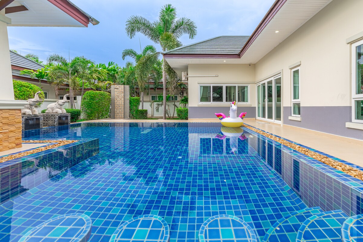 亲爱的房客朋友,您好! ①探索别墅,这是一个令人惊叹的角落房源,拥有3间装饰精美的卧室,风格奢华。 享受宽敞的生活。 这栋别墅距离迷人的海滩和当地景点仅几分钟路程,是家庭和朋友的理想度假胜地。 配备空调、烧烤区、无线网络等便利设施。 ②我们的房源位于许多景点的中心地带!距离以下列表仅5分钟路程: -赛凯海滩( Sai Kaew Beach ) - Legend Siam -邦萨尔海滩 -哥伦比亚水上乐园 -邦萨尔( Bang Sare )生鲜市场 -东芭乐园( Nong Nooch Tropical Garden ) -班安菲海滩( Ban Amphoe Beach ) - Khao Chi Chan -银湖葡萄园( Silverlake Vineyard ) - Upside Down House -距离Jomtien海滩20分钟车程 ③别墅出行方便,生活便利,安静舒适,能容纳6人聚餐,超大客厅餐厅,管家24小时免费贴心服务 ④有偿服务 曼谷芭提雅接送机、各大秀场门票优惠预定、高端定制、租车、包车、包船、翻译、地陪向导、厨师等。