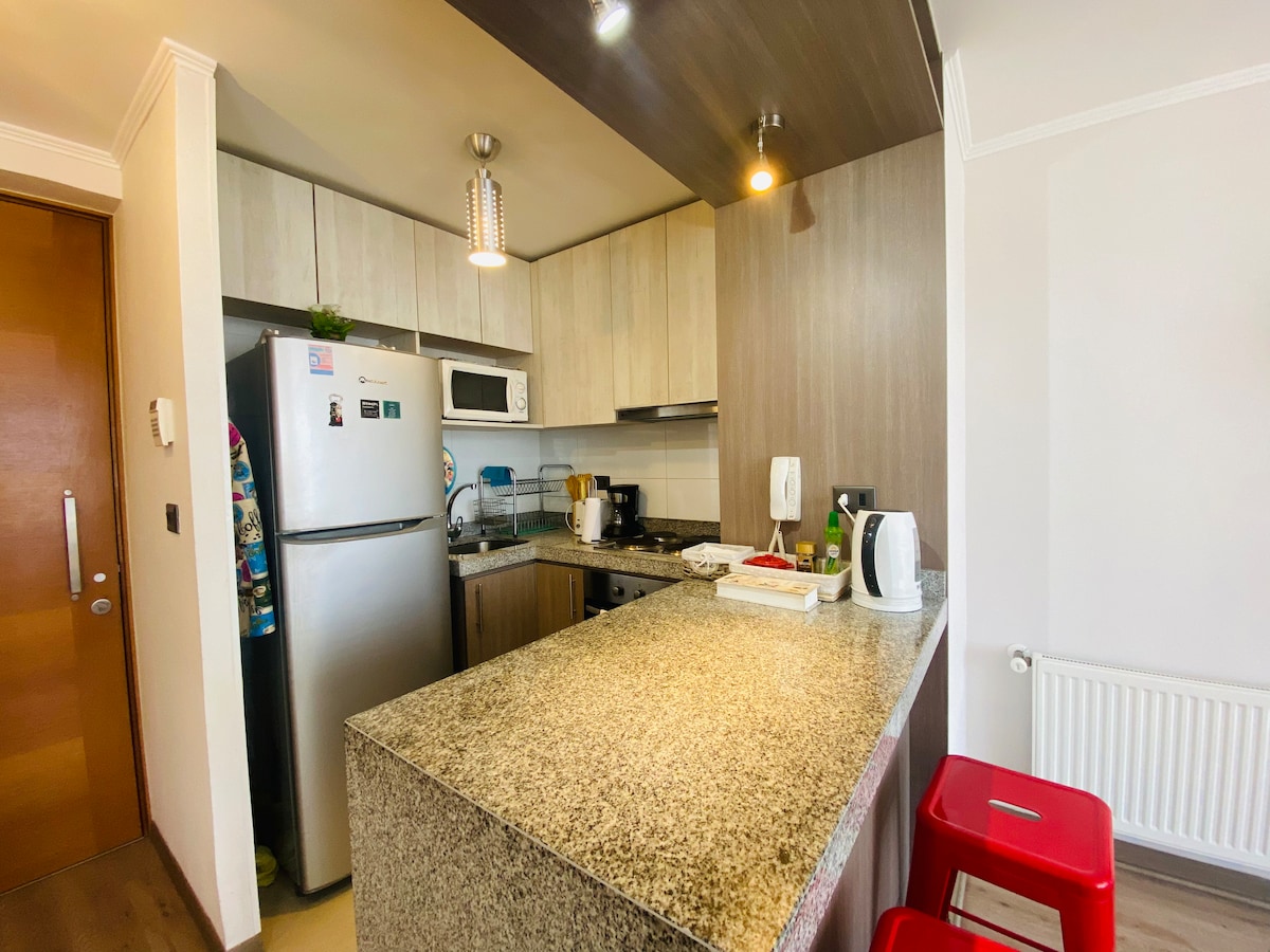 Disfruta de este departamento nuevo, full equipado para dos personas, cerradura inteligente, céntrico y muy cómodo, ideal para alojarse en Concepción. A pasos de la Universidad de Concepción, Hospital Regional, Tribunales, etc El edificio cuenta con Seguridad conserjería 24/7, Circuito Cerrado de Tv, Estacionamiento privado Subterráneo y Lavandería del edificio