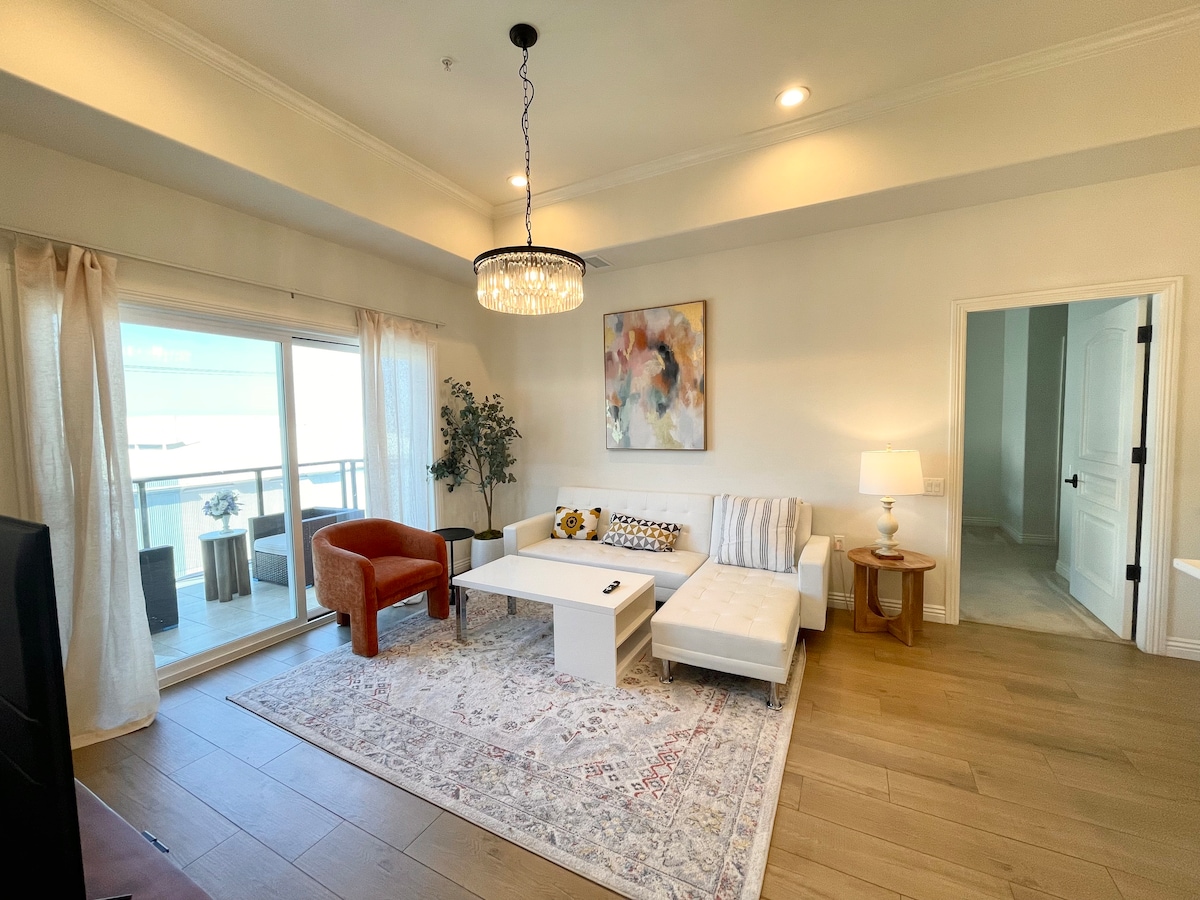 A modern wonder w/ stainless steel upgraded appliances. A high end luxury complex. Approximately 925 sq ft. Cali KING Bed. Smart 55” TV in the bedroom. A 65” Smart TV in the living room. You can log-in to your personal Smart TV Apps. Private patio with table and two chairs. In unit washer/dryer (detergent). Perfect for a family or couple getaway, business trip or long stay. Always clean and ready when you arrive. Prime location in Irvine near 405 freeway. Please ask us any questions.