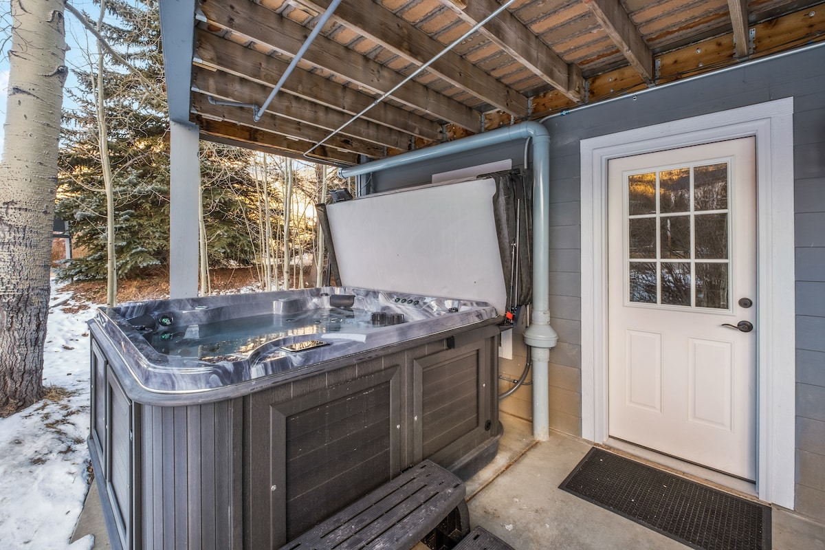 This 3BR 2 1/2BA has an open layout facilitating group/family interaction. From living area, glass doors open to deck with hot tub. From deck and living area, mountain views prevail in the winter and towering aspens provide shade in summer. A master suite is located steps above the living area and two bedrooms are located just below entry level. The back deck supporting the hot tub is on the main level directly outside the main living area.