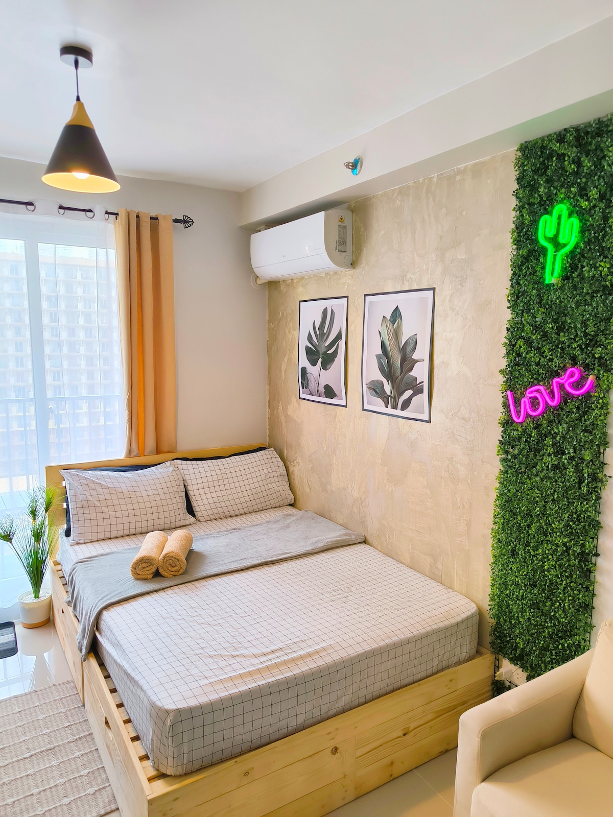 Pihenj ebben a teljesen otthonos, modern és élénk 1Br társasházi lakásban, amely EGY MANCHESTERI HELYEN, Mactan Newtownban, Lapu-lapu Cityben található. Ahol közel van 5 csillagos üdülőhelyek, éttermek, kávézók és szupermarketek. - 10-15 perc autóútra a Mactan repülőtértől - Intelligens záras hozzáférés - 50 Mbps WI-FI - Ingyenes Netflix - Teljesen felszerelt konyha (FONTOS FIGYELMEZTETÉS: Kérjük, tekintsd át az alábbi ingatlanleírásokat a foglalás előtt)