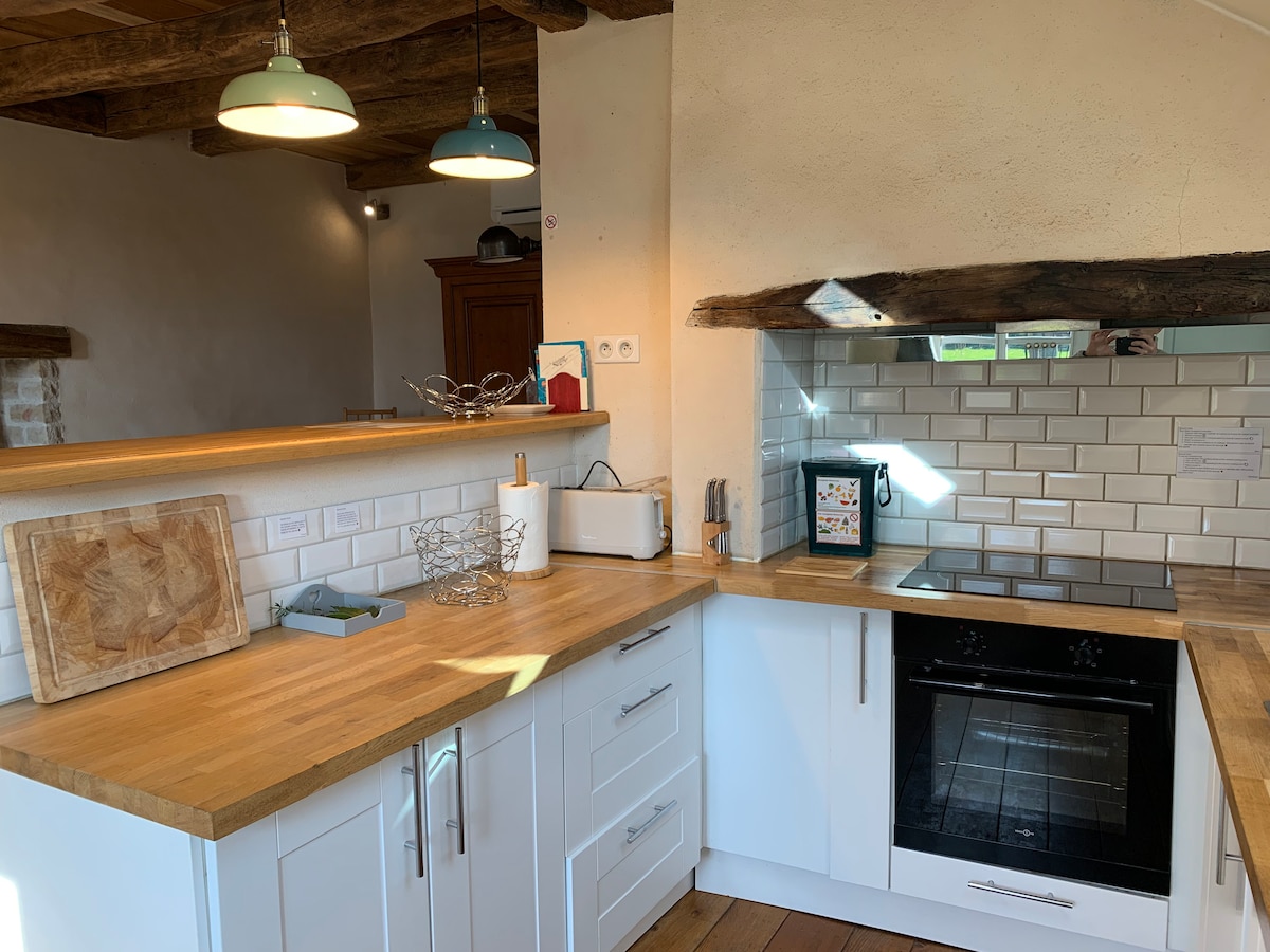2020 augusztusában teljesen felújított kis parasztház. 2 hálószoba 2 fő mindegyik saját fürdőszobával. Nagyon kényelmes ágy 2 fő részére a nappaliban. Plusz egy harmadik fürdőszoba. Gyönyörű nappali kandallóval , teljesen felszerelt konyha, sütő, mosogatógép , mikrohullámú sütő,kávéfőző olvasztott készülékek, vízforraló,kenyérpirító, mosógép és szárítógép. társasjáték,nagy erdős park 5000 m2-es grill. Terasz a parkban. Zárt fedett parkoló több autó számára. Kereskedelem és étterem a producer közelében található organikus hentes 50 méterre. Minden összejön, hogy eltöltsünk egy hétvégét a barátaiddal és a családoddal a természet szívében.