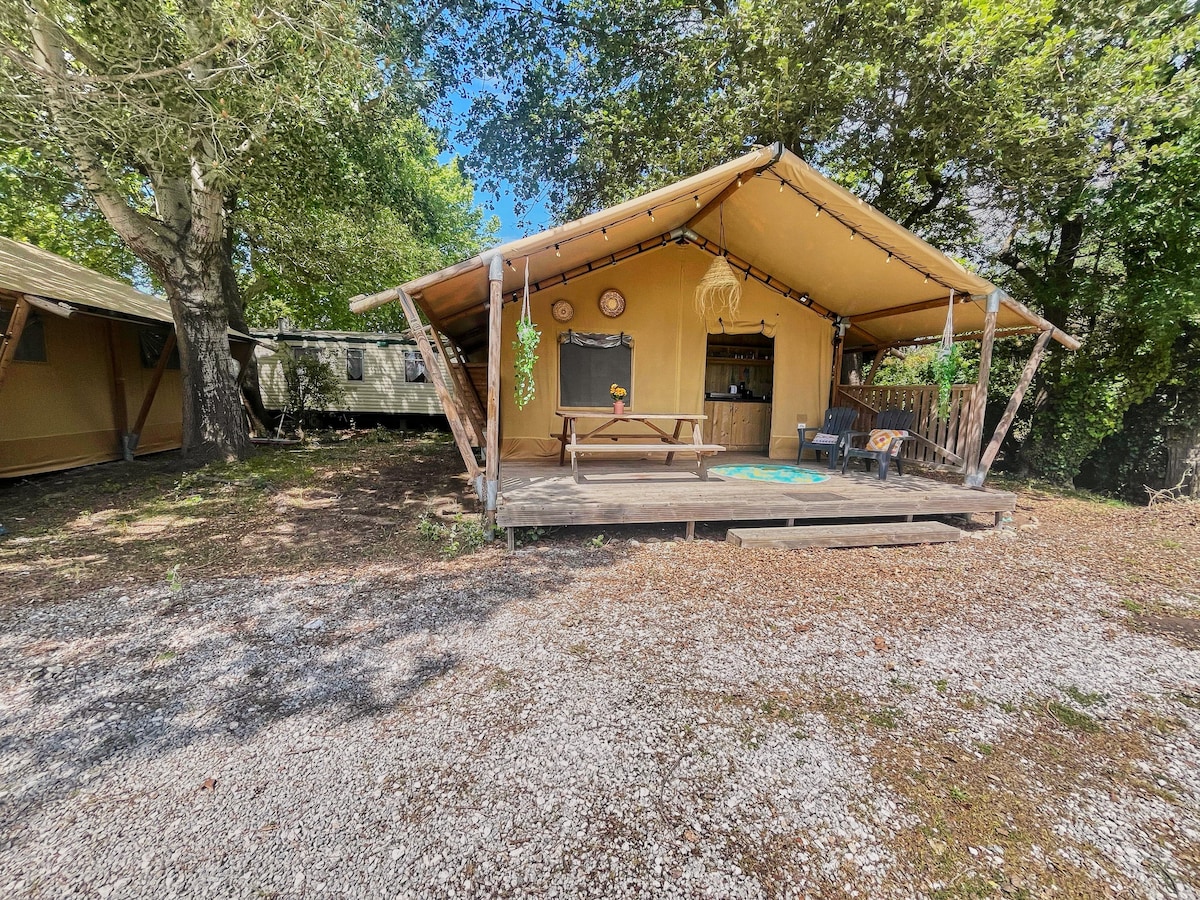 Luxus glamping sátrunk nagy fedett verandával a kempingben található, közel a recepcióhoz, az úszómedencéhez, az étteremhez és a vécéépülethez. Mindez kevesebb mint 50 méterre van. A sátorban 2 hálószoba található queen méretű ággyal és emeletes ággyal, zuhanyzóval, vécével, nappalival és fedett verandával, ahol pihenhetsz, miközben egy kis harapnivalót és italt fogyasztasz az étkezőasztalnál vagy a bárkészletnél. Éttermek, falu és strand közelében, tökéletes elhelyezkedés.