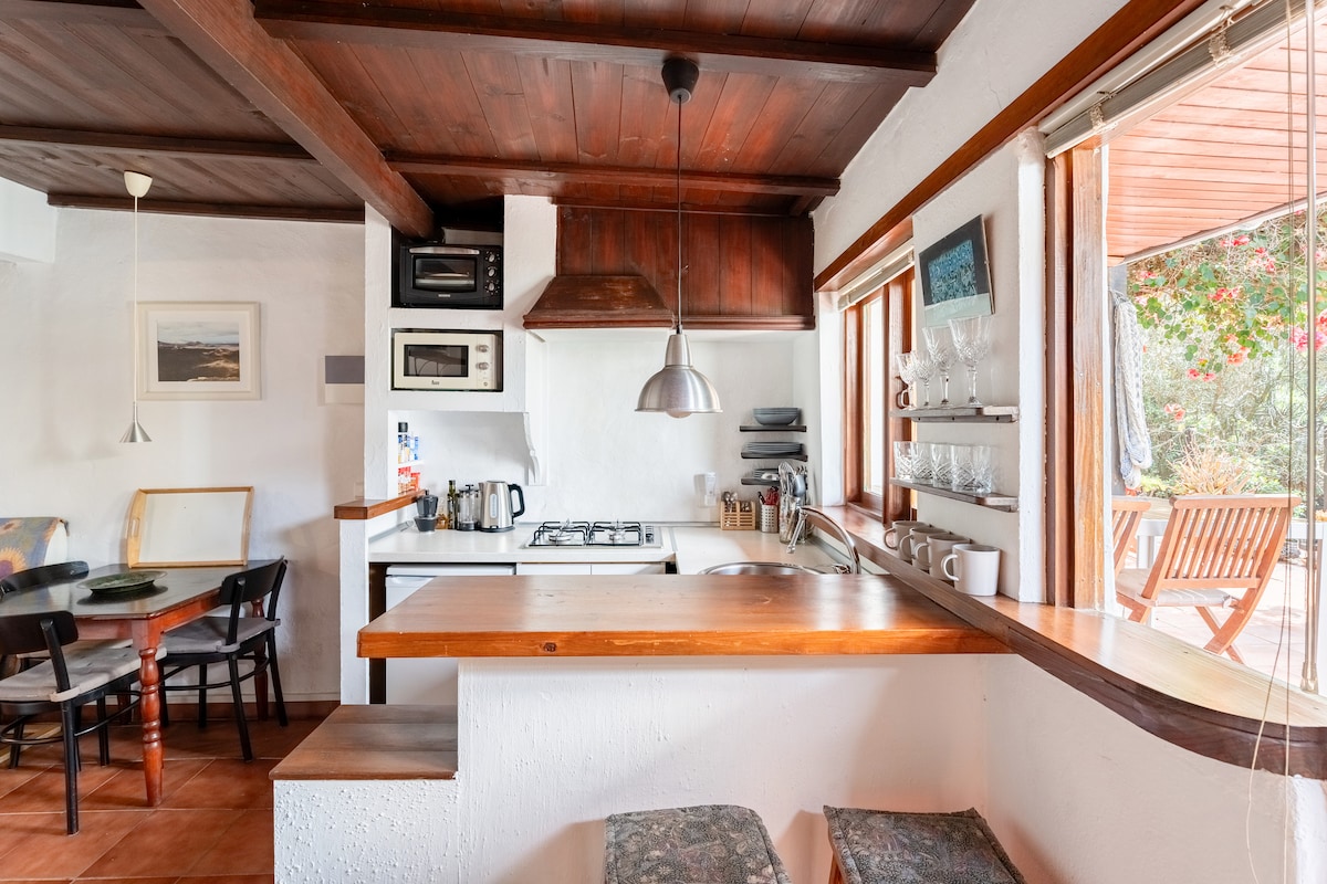 This apartment consists of a romantic king-sized sleeping area, dining area seating 4, comfortable living area, small well-equipped kitchen, large bathroom, plenty of cupboard space, internet TV. The living area opens onto its patio and the garden. Sleeps 2 adults, sofa bed can accommodate children. The large solar water heater guarantees that your shower will never run cold and indoor heating removes any possible discomfort from the cool winter nights this desert island sometimes experiences.
