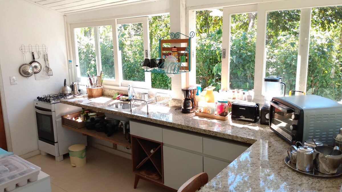 Házunk világos, jól szellőzik és hangulatos, 50 méterre a Praia Grande strandtól, amely Ilhabela egyik legjobb strandja! Három légkondicionált hálószoba van ágyneművel és törölközőkkel, amelyek közül kettő saját fürdőszobával rendelkezik. A konyha teljesen felszerelt mikrohullámú sütővel, készülékekkel és minden edénnyel. A nappaliban okostévé van Sky HD-vel. Van Wi-Fi, parkoló, mosógép, erkély, grill, zuhanyzó és kilátás az óceánra. A közelben jó éttermek, pizzériák, bárok, piacok, borászat, pékségek és gyógyszertárak találhatók.