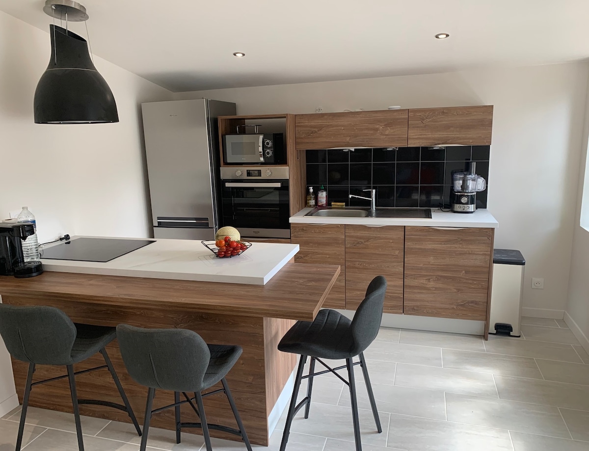 Maison lumineuse avec vue verdoyante et terrasse ensoleillée. Profitez d’un séjour au calme dans cette maison moderne et chaleureuse, baignée de lumière grâce à de grandes baies vitrées. Le salon confortable s’ouvre directement sur une terrasse en bois avec coin repas, parasol et vue imprenable sur un jardin arboré. Espace de vie cosy avec canapé d’angle, fauteuil design, TV et décoration soignée. Parfait pour se détendre, proche de la mer, tout en restant à proximité des commodités.