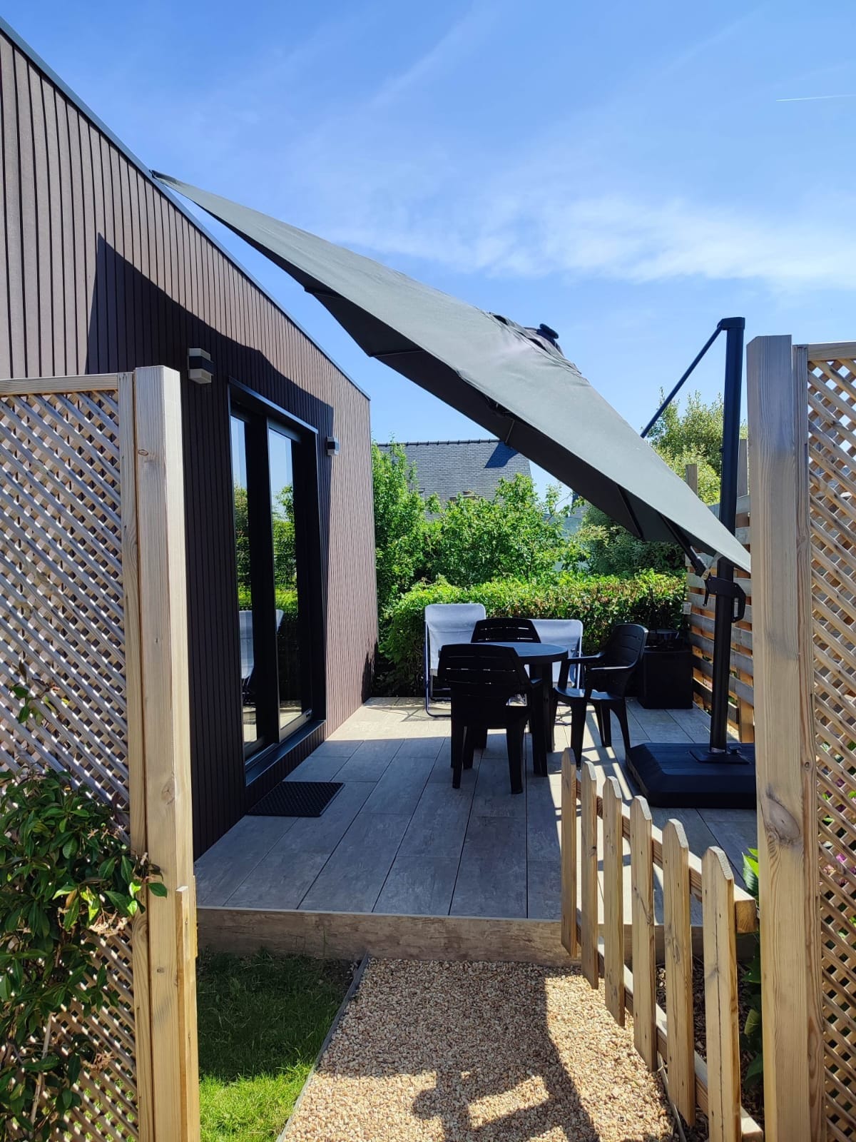 A miniház magánterületen található, a GR 34 közelében, Lanmodez településen. Egy felszerelt konyhából, egy zuhanyzóval és száraz vécével rendelkező fürdőszobából áll. Ha aludni szeretnél, van egy félemelet két főre, egy második pedig 1 gyermek számára, és egy kabriópad. Kint egy terasz kerti bútorokkal ,grillezőhelyekkel és napágyakkal .