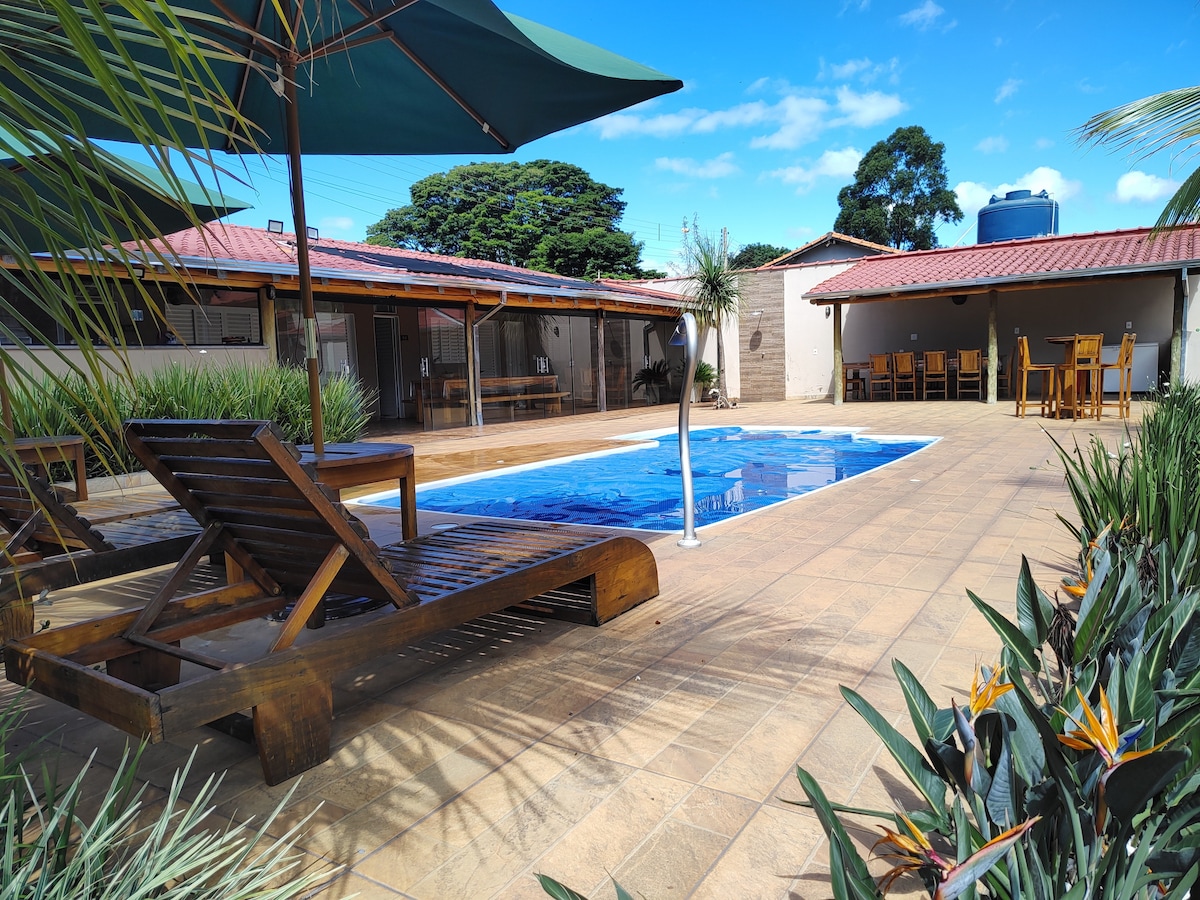 um salão climatizado!!! Com capacidade para até 200 pessoas, banheiros, cozinha ampla e equipada para buffet com fogão e forno industrial! tinas e conservadoras para bebidas, mesas redondas com toalhas e cadeiras de aço inclusas. Quatro suítes, com uma cama de casal e duas beliches em cada quarto, com a capacidade total de até 24 pessoas. Área de churrasco grande, com piscina aquecida. Além de quadra de areia, parquinho para crianças, balanços e redes de descanso, sofás ao ar livre