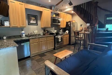 Unique efficiency suite completely remodeled as of November, 2020. This house is tucked away in a great neighborhood, making you feel like you are out in the woods on a private creekside retreat. You have 2 acres of creekside property all to yourself. Upgrades in the home include new stainless steel appliances, beautiful granite counters, gorgeous custom tilework in the bathroom, a fantastic covered deck overlooking the rear of the property and it is comfortably furnished and fully stocked.
