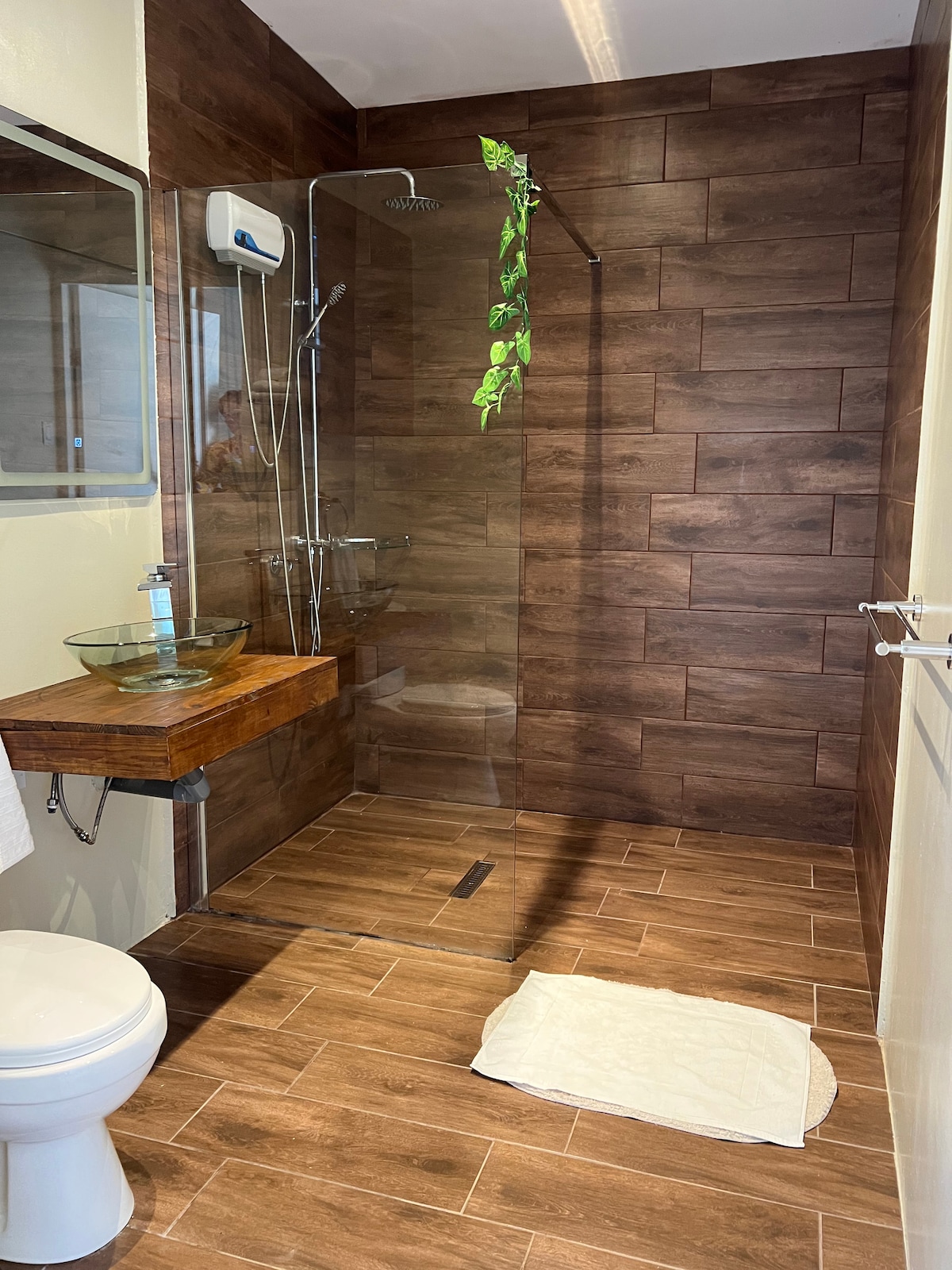Hangulatos első emeleti 50 négyzetméteres apartman a Bamboo Suites-ben biztonságos, elzárt parkolóval, tágas saját erkéllyel és nyugodt kilátással a vízeséses medencére. Pihenj nyugodtan a légkondicionálóval és a sötétítő függönyökkel a pihentető alváshoz. Saját fürdőszobával rendelkezik, meleg zuhanyzóval és árammal – kérjük, körültekintően használd őket a környezet védelme érdekében. Lakásunk 110 voltos és 220 voltos aljzatokkal is fel van szerelve, így könnyedén csatlakoztathatod a készülékeidet.