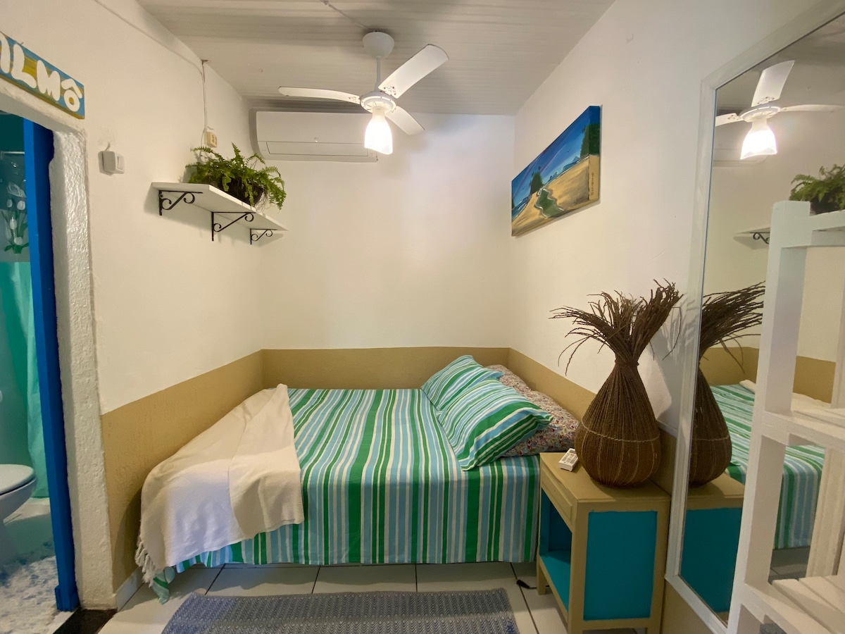 O Quarto Júnior está localizado no primeiro andar, sendo necessário subir 15 degraus. É acolhedor, com 15 m² e possui uma varanda de acesso com vista para o mar. Equipado com uma cama de casal, ar-condicionado split, TV de LED, frigobar, Wi-Fi gratuito e banheiro privativo com chuveiro a gás e secador de cabelo. Acomoda até 2 pessoas.