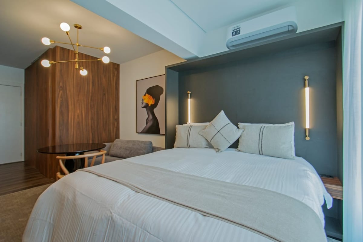 Érezd otthon magad ebben az újonnan felújított dizájnstúdióban, ahol minden részletet a kényelmedre terveztek. A minimalista dekoráció csendes, kifinomult pihenőhelyet teremt egy intenzív nap után São Paulóban. Integrált tér franciaággyal, egyszemélyes ággyal, konyhával, mosógéppel és légkondicionálóval, legfeljebb 3 fő számára. A megvilágított erkély ideális hely a munkához, olvasáshoz vagy pihenéshez. Az épületben 24 órás portaszolgálat garantálja a biztonságot. Csendes lakónegyed tömegközlekedéssel, piacokkal és éttermekkel a közelben.