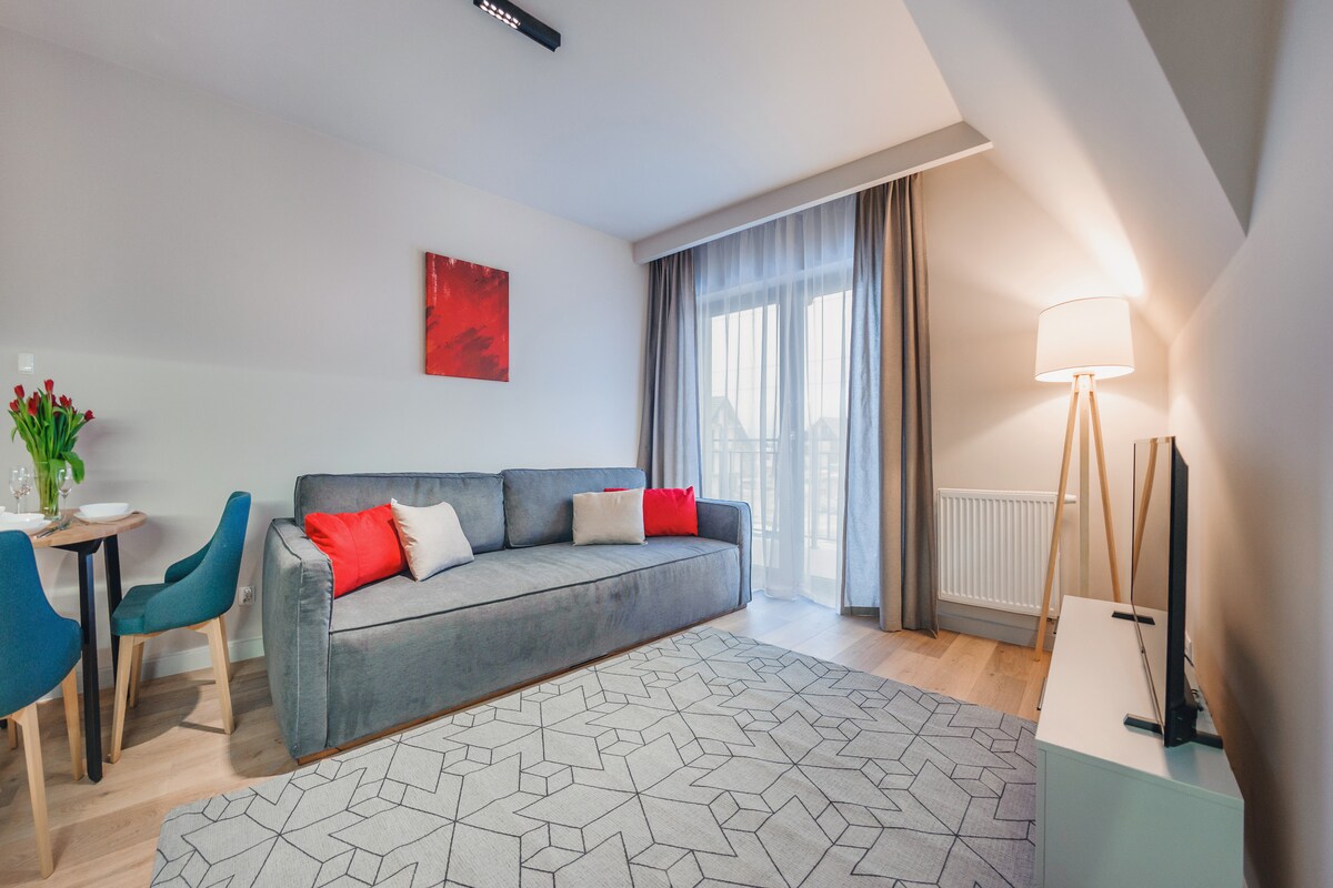 Az apartman a gyönyörű Czorsztyn-tó partján, a Pieniny-hegység lábánál található. Nyáron az aktívak értékelni fogják a közel 40 km-t, Lengyelország legszebb kerékpárútját, amely a tó körül fut, a strandok vagy a vízfelszerelés bérlésének lehetőségét. Télen számos sípálya és akár 4 különböző hegylánc is közel van. A 2021-ben megnyitott ingatlan jól felszerelt edzőteremmel, szaunával, kerékpárszobával, síszobával és mosókonyhával rendelkezik.