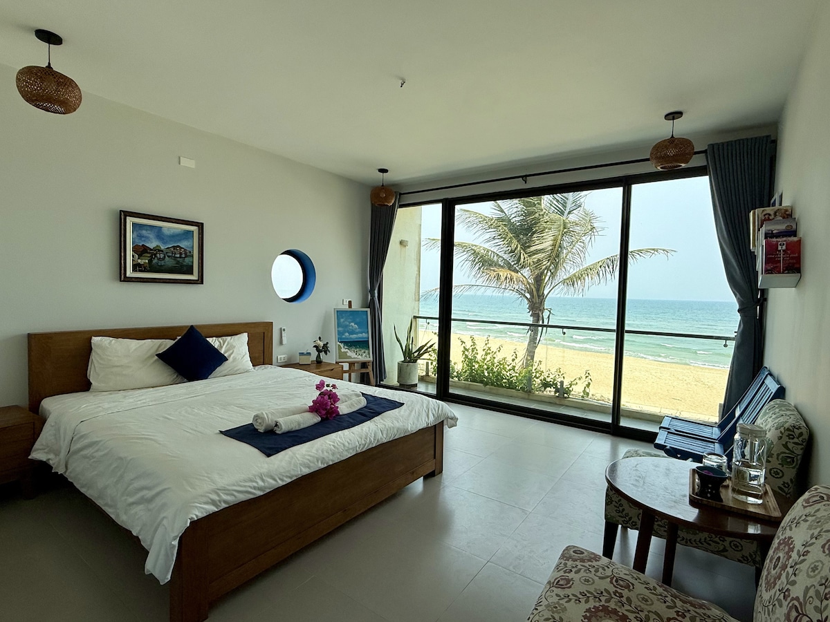 Perfect for families or friends traveling together, these two oceanfront rooms of Mi Casa Beachfront offer both connection and privacy. Located on the 1st floor next to the living area and kitchen, each 27m² room features an ensuite bathroom and private sea-view balcony. Floor-to-ceiling glass fills the space with light and ocean views. La Luna brings a calm blue tone, while El Sol glows with warm yellow. Thoughtfully decorated with artwork by the host, creating a cozy and shared coastal stay.