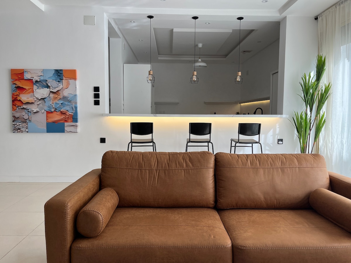 *Üdvözlünk az otthonodban, amelyet kertek és sétautak vesznek körül. * Intelligens akadálymentesítés. * Luxus, szemészeti szállodai bútorok mindennel, amire szükséged van. * Külön hálószoba a neked szóló specifikációkkal: 1 - Tágas fő fürdőszoba esőzuhannyal a kikapcsolódáshoz . 2- Saját öltöző tágas fiókokkal az öltözködéshez 3- Privát és elegáns, 55 hüvelykes intelligens képernyő, ahol megnézheted, mit szeretsz, miközben King szállodai ágyán pihensz. *Nagyon tágas társalgó 65 hüvelykes intelligens képernyővel, kávézósarokkal és pihentető sarokkal. *Konyha sütővel, hűtőszekrénnyel, mosógéppel és speciális vasalósarokkal.