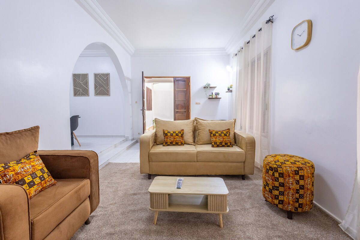 Menekülj ebbe a kifinomult F3-ba Ngor Almadiesben, rövid sétára a strandtól és Dakar legnépszerűbb címeitől. 2 elegáns hálószoba zuhanyzóval, világos nappali saját erkéllyel, teljesen felszerelt konyha, légkondicionálás és nagy sebességű Wi-Fi. Ingyenes Nespresso kapszulák és teák. A környék biztonságos, és személyre szabott fogadtatásban lesz részed a szálláshelyen töltött időd során. Élvezd az utazást elegáns kényelemben és nyugodt környezetben, akár pihenni, felfedezni vagy üzletelni érkeztél.