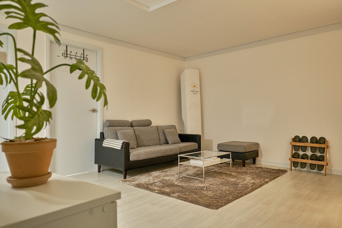 Ez egy kétszintes családi ház, amely 2 perc sétára található a Cachiul állomás 3-as és 4-es kijáratától a 7-es vonalon. Az ár tartalmazza a vendégek által az Airbnb-nek fizetett szolgáltatási díjat. A növényzet bőséges, így jó sétálni, a környéket pedig kis hegyek veszik körül, így otthonos és csendes. Körülbelül 35 pyeong 3 hálószobával, 2 fürdőszobával és 1 tágas nappalival. Parkolás 2 autó számára a ház előtt. Natural Ecological Park 10 perces sétával elérhető. Bernecheon Trail. Cafe Street 5 perc alatt elérhető. Éttermek. Természetes ökológiai park és botanikus kert 10 perc. Autóval 15 percre a Gimpo repülőtértől, 20 percre vonattal. 3 másik hagyományos piac autóval 10 perc alatt elérhető. A kisbolt 1 percre van a ház előtt. Egy hely, ahol folyamatosan szeretnék megszállni, Pihenj az egész családdal ebben a nyugodt menedékhelyen.🎼 A második emeleten lakunk (házigazda). Hívj minket, ha szükséged van ránk!