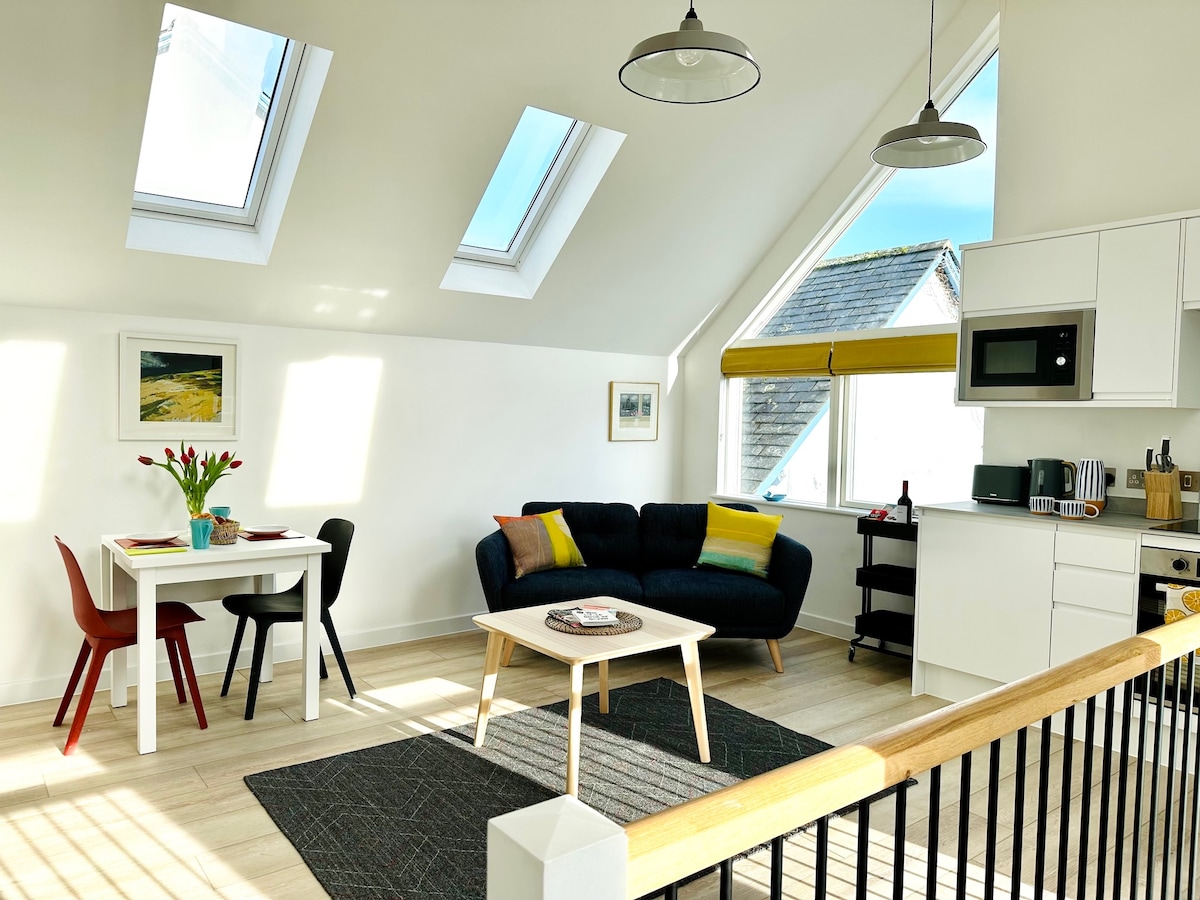Enjoy a beautifully renovated loft conversion with private access in the heart of historic Totnes just 7 minutes walk from the railway station Visit this culturally vibrant town with its Norman castle, traditional weekly markets, climate hub, independent cinema and many independent cafes restaurants shops & pubs: www.airbnb.com/slink/u7YFDN4Y Enjoy stunning walks along the river Dart from our front door or visit beautiful beaches or Dartmoor nearby Ideal for couples, young families, friends