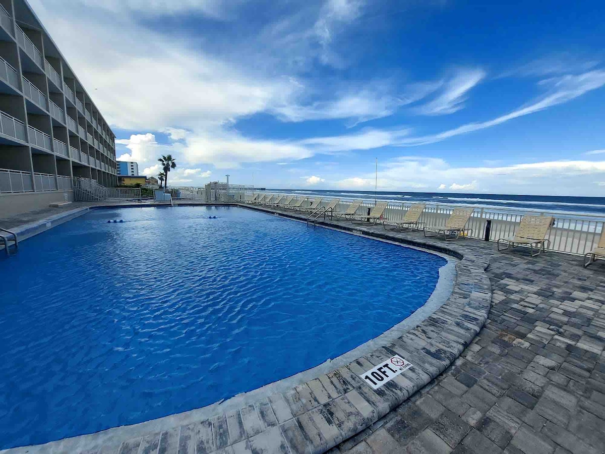 We are one of the closest airbnb to the boardwalk, OnThe Worlds Most Famous Beach with an open Pool 65inch Tv Come enjoy our Newly Furnished Studio with Amazing Top Floor Beach Views. We are the Closest AIRBNB on the Beach to the Daytona International Speedway With king bed and Queen sleeper sofa. Centrally located in the Heart of Daytona Beach. walking distance to the Pier Boardwalk, Restaraunts, and Main Street We have FREE parking for 1 vehicle and provide Coffee,Cream,Sugar,bch chairs.