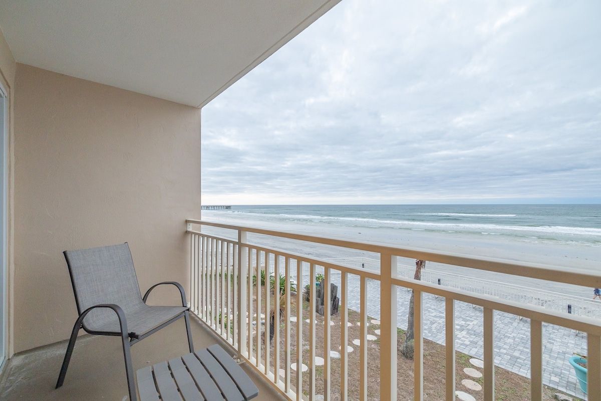 Just steps from the beach, this bright and spacious 2-bedroom, 2-bath direct oceanfront condo is your perfect coastal getaway. Wake up to panoramic ocean views, sip coffee on the large private balcony, and fall asleep to the sound of the waves. The condo is fully equipped including beach chairs and gear, washer and dryer, ultra-fast Wi-Fi, and free parking. Enjoy a newly renovated oceanfront pool, comfortable beds for up to six guests, and three large smart TVs for streaming your favorite shows.